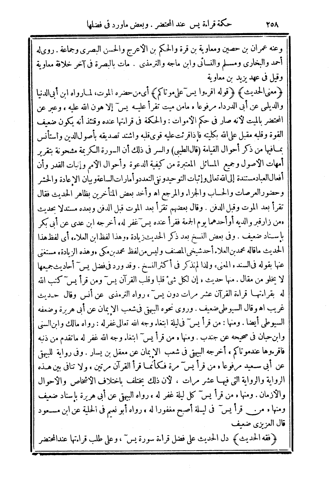 ومنها "من قرأ يس ابتغاء وجه الله غفر له ما تقدم من ذنبه فاقرءوها عند موتاكم" أخرجه البيهقي في شعب الإيمان عن معقل بن يسار. وفي رواية للبيهقي عن أبي سعيد مرفوعًا "من قرأ يس مرة فكأنما قرأ القرآن مرتين" ولا تتنافى بين هذه الرواية والرواية التي فيها عشر مرات, لأن ذلك يختلف باختلاف الأشخاص والأحوال والأزمان.