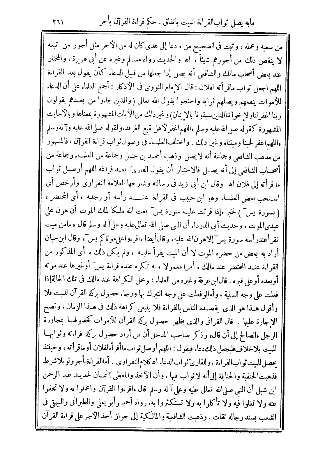 واختلف العلماء في وصول ثواب قراءة القرآن, فالمشهور من مذهب الشافعي وجماعة أنه لا يصل وذهب أحمد بن حنبل وجماعة من العلماء وجماعة من أصحاب الشافعي إلى أنه يصل فالاختيار أن يقول القارئ بعد فراغه اللهم أوصل ثواب ما قراته إلى فلان اهـ