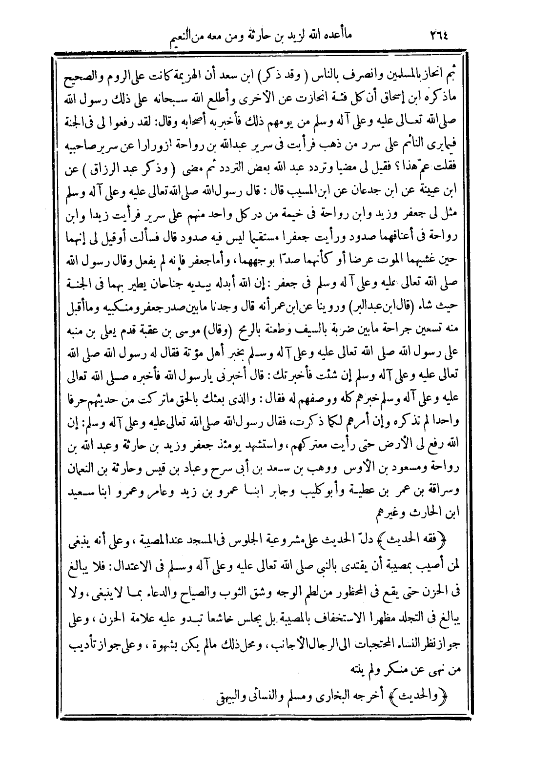 (فقه الحديث) دل الحديث على مشروعية الجلوس في المسجد عند المصيبة وعلى أنه ينبغي لمن أصيب بمصيبه أن يقتدي بالنبي صلى الله تعالى عليه وعلى آله وسلم في الاعتدال: فلا يبالغ في الحزن حتى يقع في المحظور من لطم الوجه وشق الثوب والصياح والدعاء بما لا ينبغى ولا يبالغ في التجلد مظهرًا الاستخفاف بالمصيبة بل يجلس خاشعًا تبدو عليه علامة الحزن وعلى جواز نظر النساء المحتجبات إلى الرجال الأجانب, ومحل ذلك ما لم يكن بشهوة وعلى جواز تأديب من نهى عن منكر ولم ينته