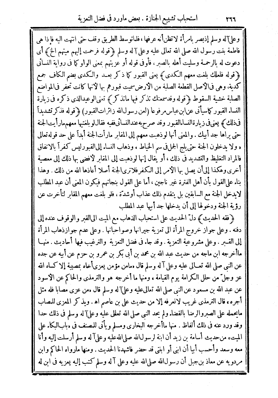 ومنها ما أخرجه هو والترمذي والحاكم عن الأسود عن عبد الله بن مسعود عن النبي صلى الله تعالى عليه وعلى آله وسلم قال "من عزى مصابًا فله مثل أجره" قال الترمذي غريب لا نعرفه إلا من حديث علي بن عاصم. ويذكر المعزي للمصاب ما يحمله على الصبر والرضا بالقضاء ولم يحد النبي صلى الله تعالى عليه وعلى آله وسلم في ذلك حدًا وقد ورد عنه في ذلك ألفاظ.