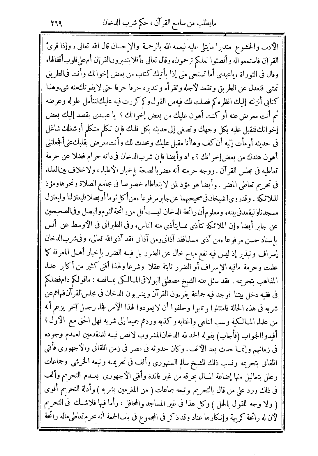 وأيضًا فإن شرب الدخان في ذاته حرم فضلًا عن حرمة تعاطيه في مجلس القرآن. ووجه حرمته أنه مضر بالصحة بأخبار الأطباء, ولا خلاف بين العلماء في تحريم تعاطي المضر. وأيضًا هو مؤذ لمن يتعاطاه خصوصًا في مجامع الصلاة ونحوها ومؤذ للملائكة. وقد روى الشيخان في صحيحهما عن جابر مرفوعًا "من أكل ثومًا أو بصلًا فليعتزلنا وليعتزل مسجدنا وليقعد في بيته" ومعلوم أن رائحة الدخان ليست أقل من رائحة الثوم والبصل وفي الصحيحين عن جابر أيضًا "إن الملائكة تتأذى مما يتأذى منه الناس" وفي الطبراني في الأوسط عن أنس بإسناد حسن مرفوعًا "من آذى مسلمًا فقد آذاني ومن آذاني فقد آذى الله تعالى" وفي شرب الدخان إسراف وتبذير إذ ليس فيه نفع مباح خال عن الضرر بل فيه الضرر بأخبار أهل المعرفه كما علمت وحرمة ما فيه الإسراف أو الضرر ثابتة عقلًا وشرعًا
