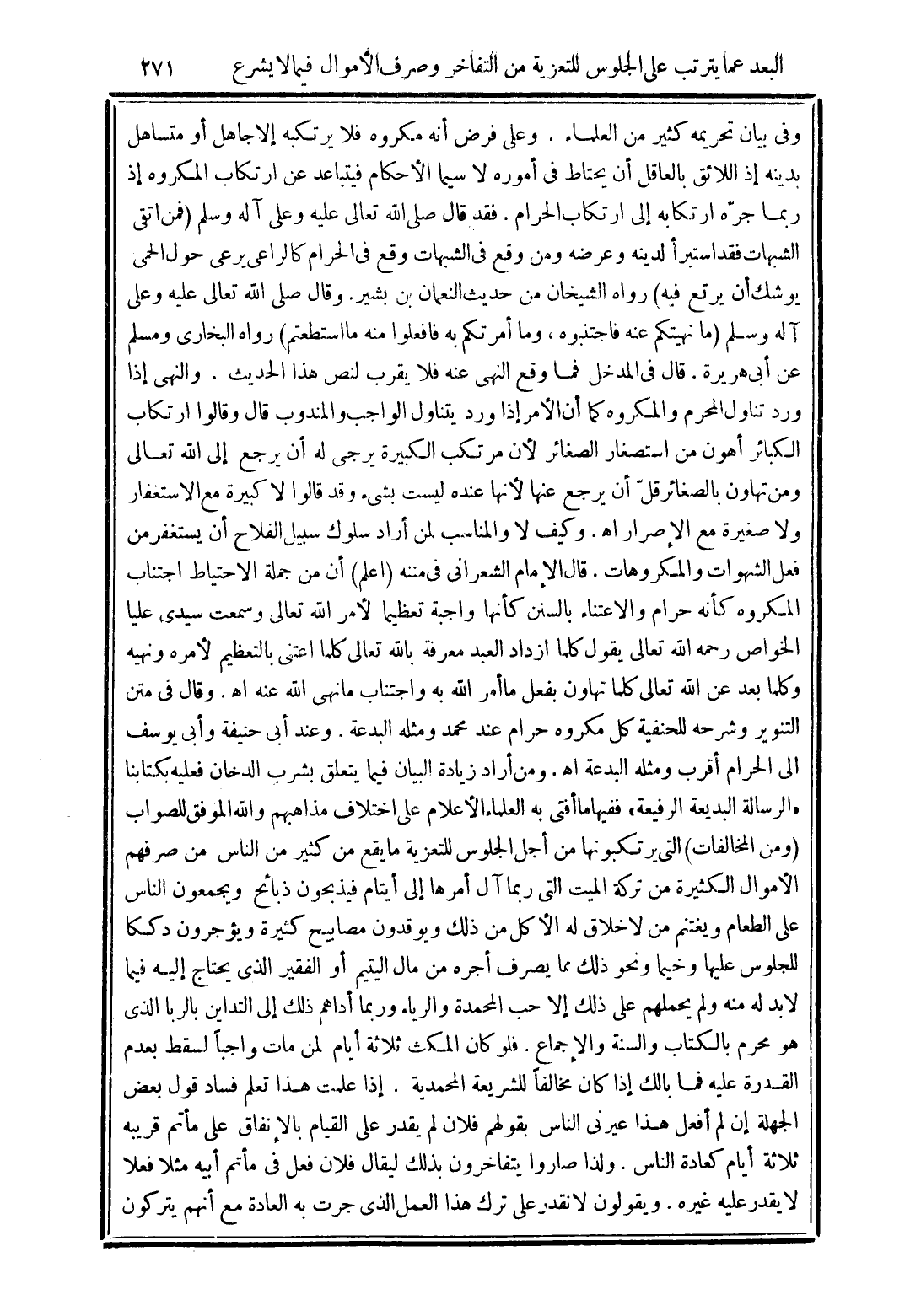 (ومن المخالفات) التي يرتكبونها من أجل الجلوس للتعزية ما يقع من كثير من الناس من صرفهم الأموال الكثيره من تركه الميت التي ربما آل أمرها إلى أيتام فيذبحون ذبائح ويجمعون الناس على الطعام ويغتنم من لا خلاق له الأكل من ذلك ويوقدون مصابيح كثيره ويؤجرون دككًا للجلوس عليها وخيمًا ونحو ذلك مما يصرف أجره من مال اليتيم أو الفقير الذي يحتاج إليه فيما لا بد منه ولم يحملهم على ذلك إلا حب المحمدة والرياء وربما أداهم ذلك إلى التداين بالربا الذي هو محرم بالكتاب والسنة والإجماع. فلو كان المكث ثلاثه أيام لمن مات واجبًا لسقط بعدم القدرة عليه فما بالك إذا كان مخالفًا للشريعة المحمدية. إذا علمت هذا تعلم فساد قول بعض الجهلة إن لم أفعل هذا عيرني الناس بقولهم فلان لم يقدر على القيام بالإنفاق على مأتم قريبه ثلاثه أيام كعادة الناس.