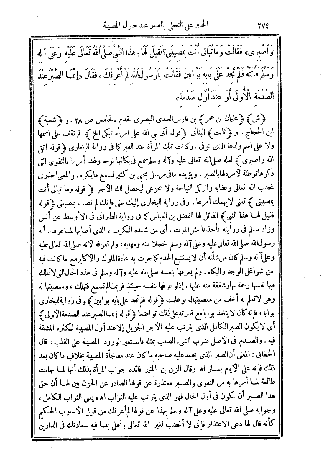 وَاصْبِرِي". فَقَالَتْ وَمَا تُبَالِي أَنْتَ بِمُصِيبَتِي فَقِيلَ لَهَا هَذَا النَّبِيُّ -صَلَّى الله تَعَالَى عَلَيْهِ وَعَلَى آلِهِ وَسَلَّمَ-. فَأَتَتْهُ فَلَمْ تَجِدْ عَلَى بَابِهِ بَوَّابِينَ فَقَالَتْ يَا رَسُولَ اللَّهِ لَمْ أَعْرِفْكَ فَقَالَ "إِنَّمَا الصَّبْرُ عِنْدَ الصَّدْمَةِ الأُولَى". أَوْ "عِنْدَ أَوَّلِ صَدْمَةٍ".