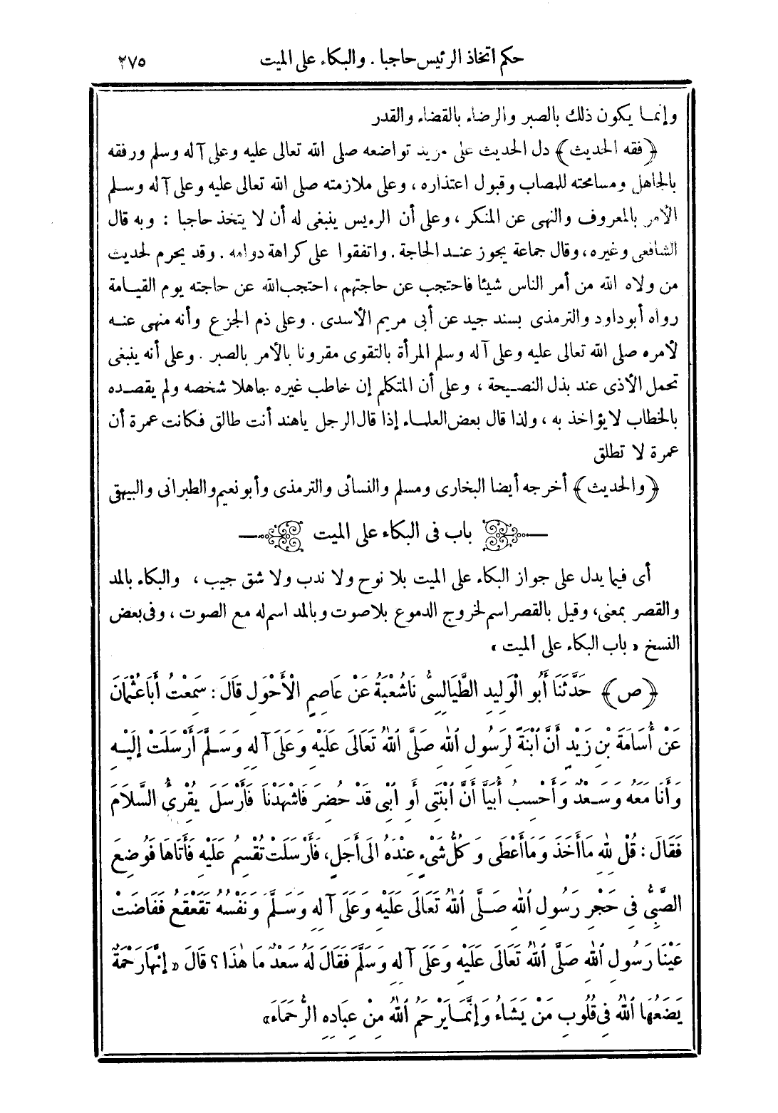 واتفقوا على كراهة دوامه وقد يحرم لحديث من ولاه الله من أمر الناس شيئًا فاحتجب عن حاجتهم, احتجب الله على حاجته يوم القيامة رواه أبو داود والترمذي بسند جيد عن أبي مريم الأسدي. وعلى ذم الجزع وأنه منهي عنه لأمره صلى الله تعالى عليه وعلى آله وسلم المرأة بالتقوى مقرونًا بالصبر. وعلى أنه ينبغي تحمل الأذى عند بذل النصيحة, وعلى أن المتكلم إن خاطب غيره جاهلًا شخصه ولم يقصده بالخطاب لا يؤاخذ به, ولذا قال بعض العلماء إذا قال الرجل يا هند أنت طالق فكانت عمرة أن عمرة لا تطلق