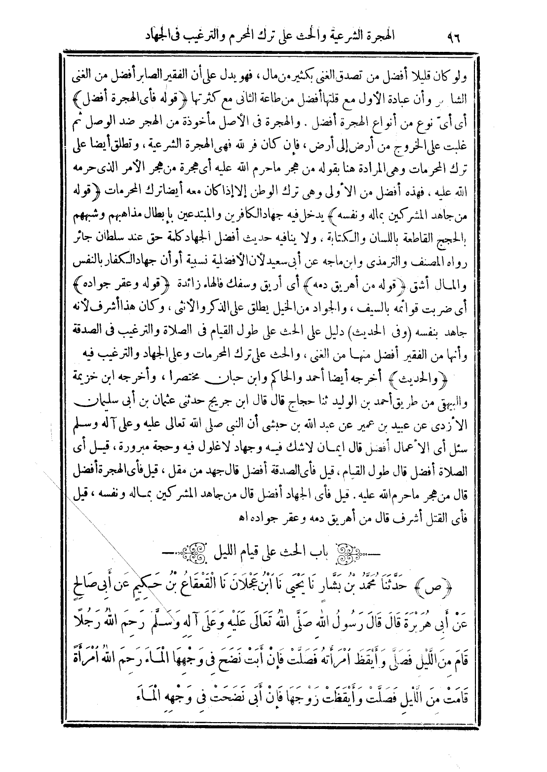 (وفي الحديث) دليل على الحث على طول القيام في الصلاة والترغيب في الصدقة وأنها من الفقير أفضل منها من الغنى، والحث على ترك المحرمات وعلى الجهاد والترغيب منه.