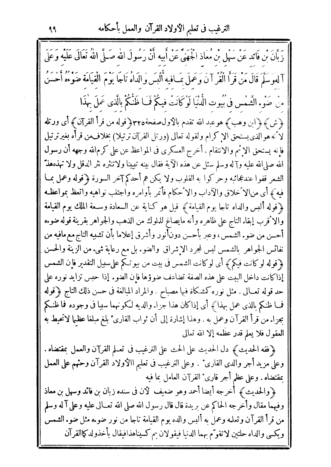 زَبَّانَ بْنِ فَائِدٍ عَنْ سَهْلِ بْنِ مُعَاذٍ الْجُهَنِيِّ عَنْ أَبِيهِ أَنَّ رَسُولَ اللَّهِ -صَلَّى الله تَعَالَى عَلَيْهِ وَعَلَى آلِهِ وَسَلَّمَ- قَالَ "مَنْ قَرَأَ الْقُرْآنَ وَعَمِلَ بِمَا فِيهِ أُلْبِسَ وَالِدَاهُ تَاجًا يَوْمَ الْقِيَامَةِ ضَوْؤُهُ أَحْسَنُ مِنْ ضَوْءِ الشَّمْسِ فِي بُيُوتِ الدُّنْيَا لَوْ كَانَتْ فِيكُمْ فَمَا ظَنُّكُمْ بِالَّذِى عَمِلَ بِهَذَا".