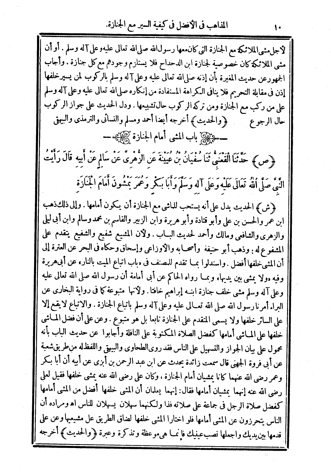 (ص) حَدَّثَنَا الْقَعْنَبِيُّ نَا سُفْيَانُ بْنُ عُيَيْنَةَ عَنِ الزُّهْرِيِّ عَنْ سَالِمٍ عَنْ أَبِيهِ قَالَ رَأَيْتُ النَّبِيَّ -صَلَّى الله تَعَالَى عَلَيْهِ وَعَلَى آلِهِ وَسَلَّمَ- وَأَبَا بَكْرٍ وَعُمَرَ يَمْشُونَ أَمَامَ الْجَنَازَةِ.