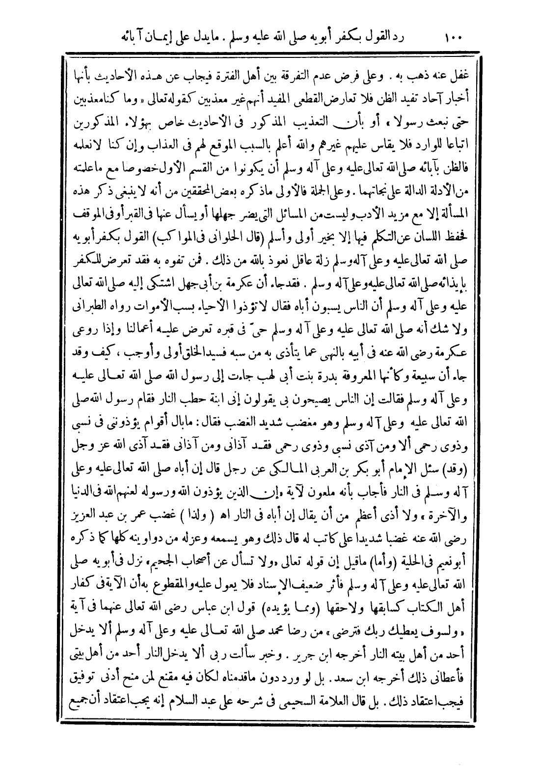 (قال الحلوانى في المواكب) القول بكفر أبويه صلى الله تعالى عليه وعلى آله وسلم زلة عاقل نعوذ بالله من ذلك. فمن تفوه به فقد تعرض للكفر بإيذائه صلى الله تعالى عليه وعلى آله وسلم. فقد جاء أن عكرمة بن أبي جهل اشتكي إليه صلى الله تعالى عليه وعلى آله وسلم أن الناس يسبون أباه فقال لا تؤذوا الأحياء بسب الأموات رواه الطبراني ولا شك أنه صلى الله تعالى عليه وعلى آله وسلم حيّ يرزق في قبره تعرض عليه أعمالنا وإذا روعي عكرمة رضي الله عنه في أبيه بالنهي عما يتأذى به من سبه فسيد الخلق أولى وأوجب، كيف وقد جاء أن سبيعة وكأنها المعروفة بدرة بنت أبي لهب جاءت إلى رسول الله صلى الله تعالى عليه وعلى آله وسلم فقالت إن الناس يصيحون بي يقولون إني ابنة حطب النار فقام رسول الله صلى الله تعالى عليه وعلى آله وسلم وهو مغضب شديد الغضب فقال: ما بال أقوام يؤذونني في نسبي وذوي رحمي ألا ومن آذي نسبي وذوي رحمي فقد آذاني ومن آذاني فقد آذي الله عَزَّ وَجَلَّ