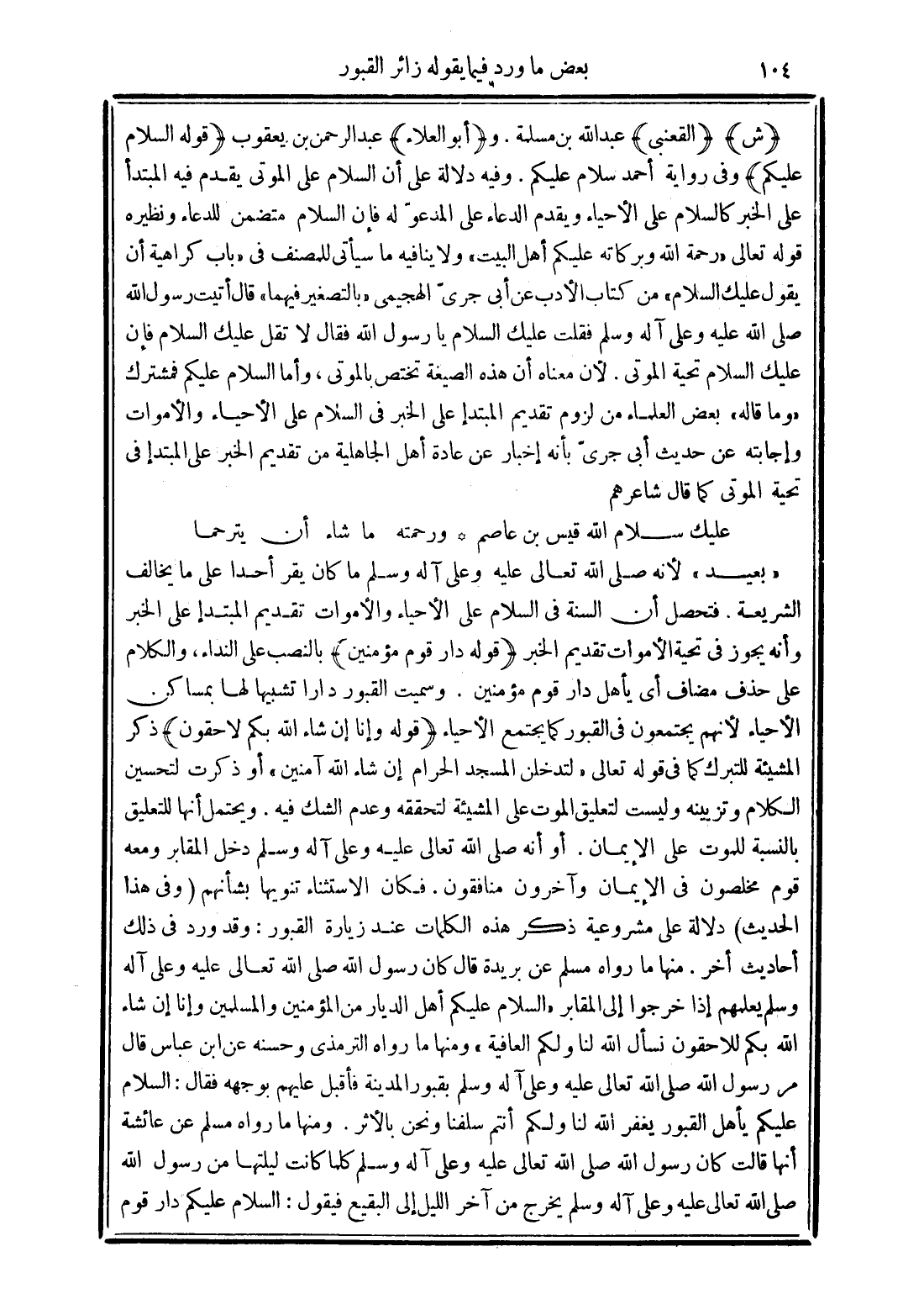 "بعيد" لأنه صلى الله تعالى عليه وعلى آله وسلم ما كان يقر أحدًا على ما يخالف الشريعة. فتحصل أن السنة في السلام على الأحياء والأموات تقديم المبتدإ على الخبر وأنه يجوز في تحية الأموات تقديم الخبر