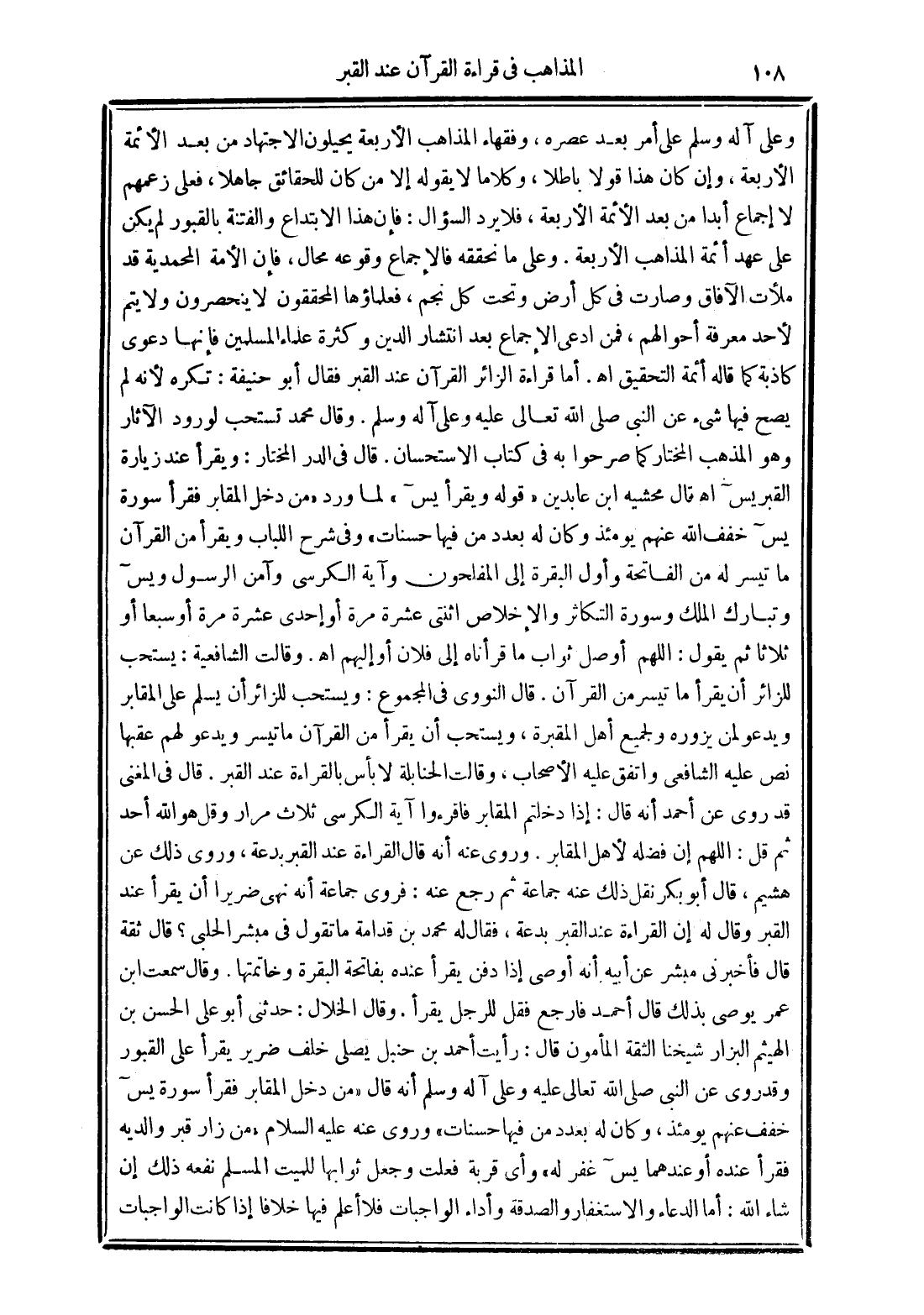 وقال الخلال: حدثني أبو على الحسن بن الهيثم البزار شيخنا الثقة المأمون قال: رأيت أحمد بن حنبل يصلي خلف ضرير يقرأ على القبور وقد روى عن النبي صلى الله تعالى عليه وعلى آله وسلم أنه قال "من دخل المقابر فقرأ سورة يس خفف عنهم يومئذ، وكان له بعدد من فيها حسنات" وروي عنه عليه السلام "من زار قبر والديه فقرأ عنده أو عندهما يس غفر له" وأي قربة فعلت وجعل ثوابها للميت المسلم نفعه ذلك إن شاء الله: أما الدعاء والاستغفار والصدقة وأداء الواجبات فلا أعلم فيها خلافًا إذا كانت الواجبات