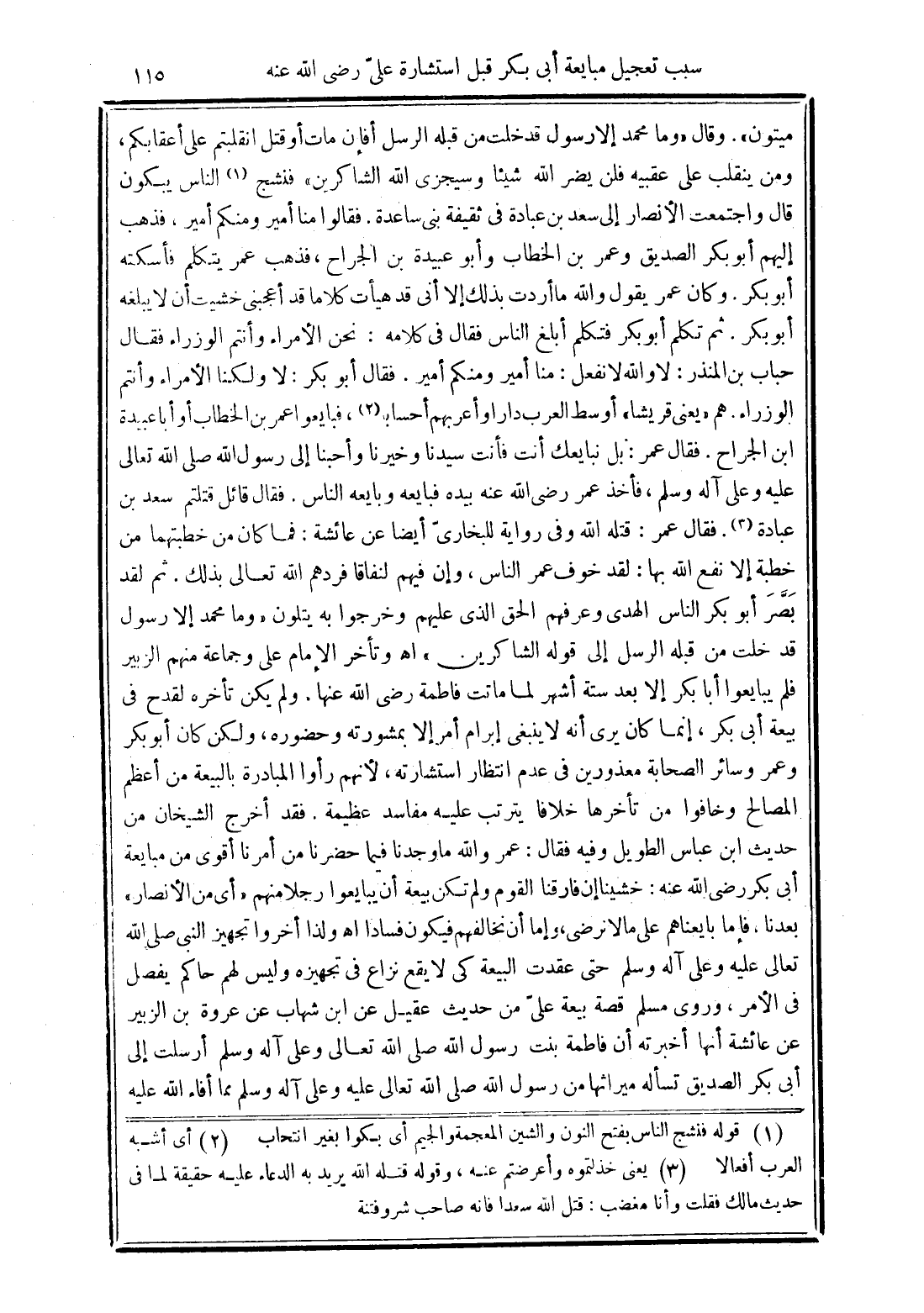قال واجتمعت الأنصار إلى سعد بن عبادة في ثقيفة بني ساعدة. فقالوا منا أمير ومنكم أمير، فذهب إليهم أبو بكر الصديق وعمر بن الخطاب وأبو عبيدة بن الجراح، فذهب عمر يتكلم فأسكته أبو بكر. وكان عمر يقول والله ما أردت بذلك إلا أني قد هيأت كلامًا قد أعجبني خشيت أن لا يبلغه أبو بكر. ثم تكلم أبو بكر فتكلم أبلغ الناس فقال في كلامه: نحن الأمراء وأنتم الوزراء فقال حباب بن المنذر: لا والله لا نفعل: منا أمير ومنكم أمير. فقال أبو بكر: لا ولكنا الأمراء وأنتم الوزراء. هم " يعني قريشًا، أوسط العرب دارا وأعربهم أحسابًا (¬2)، فبايعوا عمر بن الخطاب أو أبا عبيدة ابن الجراح. فقال عمر: بل نبايعك أنت فأنت سيدنا وخيرنا وأحبنا إلى رسول الله صلى الله تعالى عليه وعلى آله وسلم، فأخذ عمر رضي الله عنه بيده فبايعه وبايعه الناس. فقال قائل قتلتم سعد بن عبادة (¬3). فقال عمر: قتله الله وفي رواية للبخاري أيضًا عن عائشة: فما كان خطبتهما من خطبة إلا نفع الله بها: لقد خوف عمر الناس، وإن فيهم لنفاقًا فردهم الله تعالى بذلك. تم لقد بَصَّرَ أبو بكر الناس الهدى وعرفهم الحق الذي عليهم وخرجوا به يتلون "وما محمَّد إلا رسول قد خلت من قبله الرسل إلى قوله الشاكرين" اهـ
