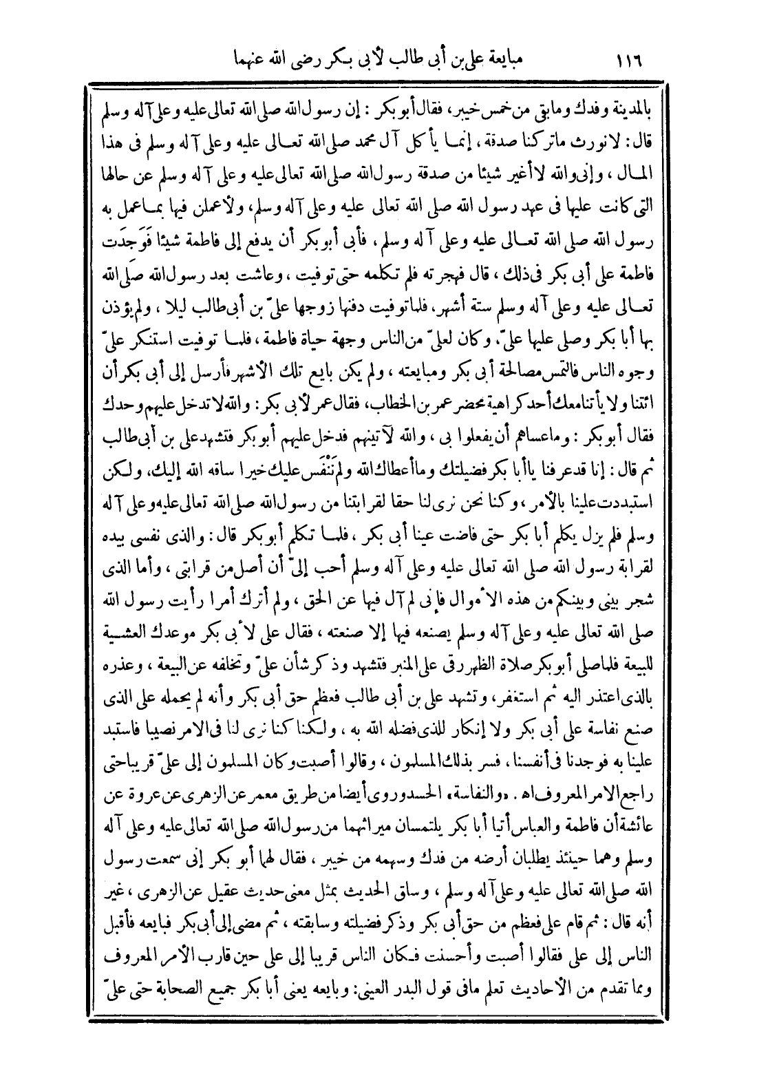 والله لا تدخل عليهم وحدك فقال أبو بكر: وما عساهم أن يفعلوا بي، والله لآتينهم فدخل عليهم أبو بكر فتشهد علي بن أبي طالب ثم قال: إنا قد عرفنا يا أبا بكر فضيلتك وما أعطاك الله ولم نَنْفس عليك خيرًا ساقه الله إليك، ولكن استبددت علينا بالأمر، وكنا نحن نرى لنا حقًا لقرابتنا من رسول الله صلى الله تعالى عليه وعلى آله وسلم فلم يزل يكلم أبا بكر حتى فاضت عينا أبي بكر، فلما تكلم أبو بكر قال: والذي نفسي بيده لقرابة رسول الله صلى الله تعالى عليه وعلى آله وسلم أحب إليّ أن أصل من قرابتى، وأما الذي شجر بيني وبينكم من هذه الأموال فإني لم آل فيها عن الحق، ولم أترك أمرًا رأيت رسول الله صلى الله تعالى عليه وعلى آله وسلم يصنعه فيها إلا صنعته، فقال علي لأبي بكر موعدك العشية للبيعة فلما صلى أبو بكر صلاة الظهر رقى على المنبر فتشهد وذكر شأن عليّ وتخلفه عن البيعة، وعذره بالذى اعتذر إليه ثم استغفر، وتشهد علي بن أبي طالب فعظم حق أبي بكر وأنه لم يحمله على الذي صنع نفاسة على أبي بكر ولا إنكار للذي فضله الله به، ولكنا كنا نرى لنا في الأمر نصيبًا فاستبد علينا به فوجدنا في أنفسنا، فسر بذلك المسلون، وقالوا أصبت وكان المسلون إلى عليّ قريبًا حتى راجع الأمر المعروف اهـ. "والنفاسة" الحسد