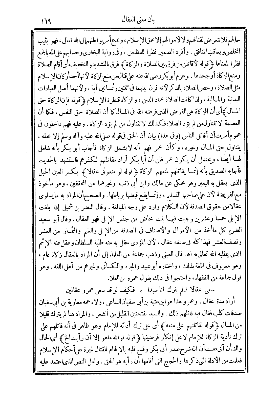 (قوله لو منعوني عقالًا) بكسر العين الحبل الذي يعقل به البعير وهو محكي عن مالك وابن أبي ذئب وغيرهما من المحققين، وهو مأخوذ مع الفريضة لأنّ علي صاحبها التسليم، وإنما يقع قبضها برباطها. والصحيح أن المراد به ما يساوي عقالًا من حقوق الصدقة لأنّ الكلام وارد على وجه المبالغة.