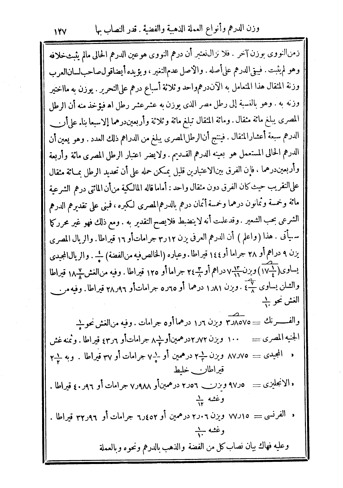 (واعلم) أن الدرهم العرفي يزن 3.12 جرامات أو 16 قيراطًا. والريال المصري يزن 9 دراهم أو 28 جرامًا أو 144 قيراطًا. وعياره (الخالص فيه من الفضة) 4/ 5.