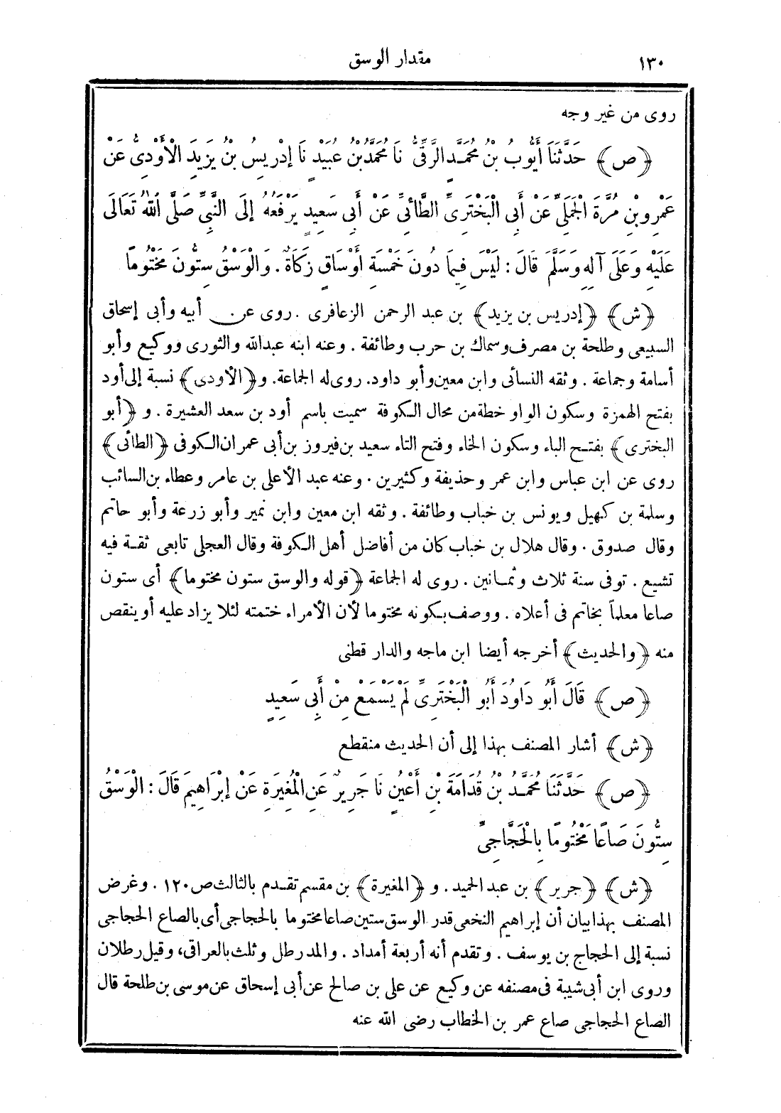 (ص) حَدَّثَنَا مُحَمَّدُ بْنُ قُدَامَةَ بْنِ أَعْيُنٍ نَا جَرِيرٌ عَنِ الْمُغِيرَةِ عَنْ إِبْرَاهِيمَ قَالَ الْوَسْقُ سِتُّونَ صَاعًا مَخْتُومًا بِالْحَجَّاجِيِّ.