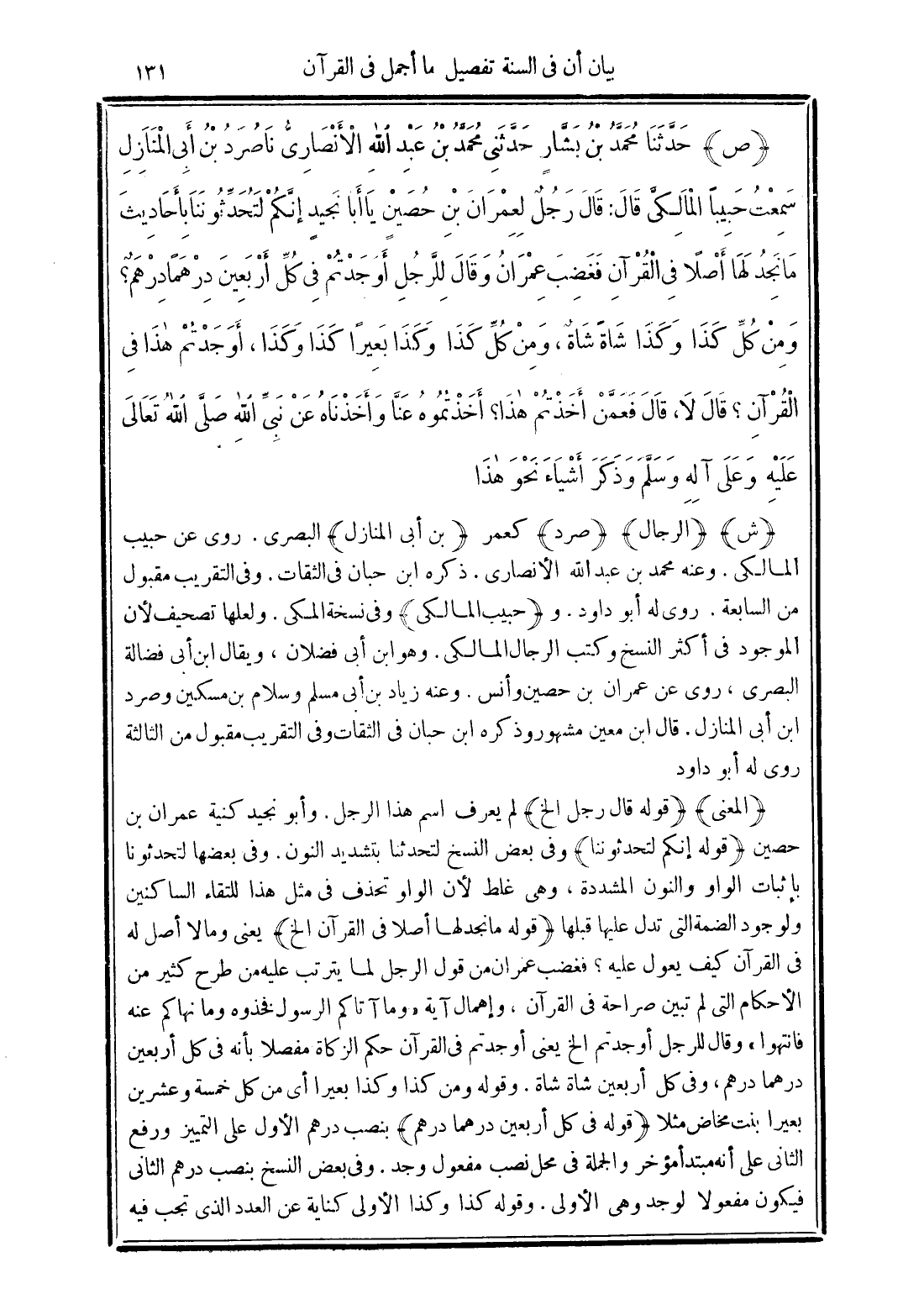 (ص) حَدَّثَنَا مُحَمَّدُ بْنُ بَشَّارٍ حَدَّثَنِي مُحَمَّدُ بْنُ عَبْدِ اللَّهِ الأَنْصَارِيُّ نَا صُرَدُ بْنُ أَبِي الْمَنَازِلِ قَالَ سَمِعْتُ حَبِيبًا الْمَالِكِيَّ قَالَ قَالَ رَجُلٌ لِعِمْرَانَ بْنِ حُصَيْنٍ يَا أَبَا نُجَيْدٍ إِنَّكُمْ لَتُحَدِّثُونَنَا بِأَحَادِيثَ مَا نَجِدُ لَهَا أَصْلًا فِي الْقُرْآنِ. فَغَضِبَ عِمْرَانُ وَقَالَ لِلرَّجُلِ أَوَجَدْتُمْ فِي كُلِّ أَرْبَعِينَ دِرْهَمًا دِرْهَمٌ وَمِنْ كُلِّ كَذَا وَكَذَا شَاةً شَاةٌ وَمِنْ كُلِّ كَذَا وَكَذَا بَعِيرًا كَذَا وَكَذَا أَوَجَدْتُمْ هَذَا فِي الْقُرْآنِ قَالَ لاَ. قَالَ فَعَنْ مَنْ أَخَذْتُمْ هَذَا؟ أَخَذْتُمُوهُ عَنَّا وَأَخَذْنَاهُ عَنْ نَبِيِّ اللَّهِ -صَلَّى الله تَعَالَى عَلَيْهِ وَعَلَى آلِهِ وَسَلَّمَ- وَذَكَرَ أَشْيَاءَ نَحْوَ هَذَا.