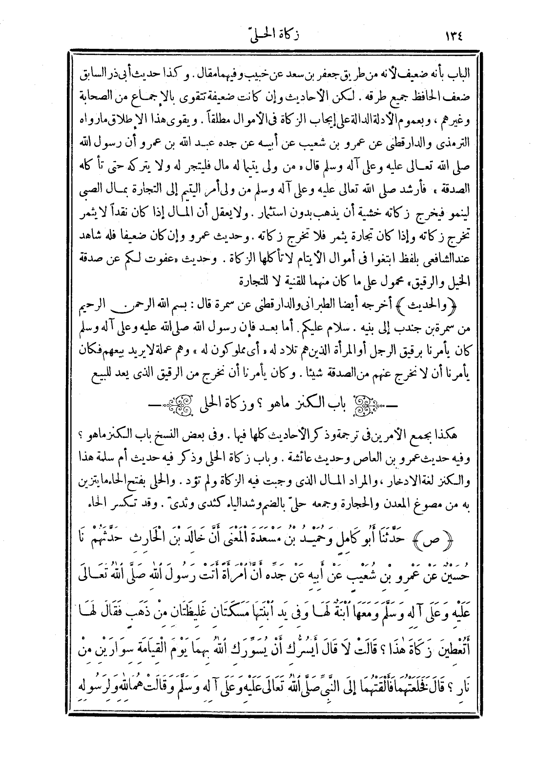 الباب بأنه ضعيف لأنه من طريق جعفر بن سعد عن خبيب وفيهما مقال. وكذا حديث أبي ذر السابق ضعف الحافظ جميع طرقه. لكن الأحاديث وإن كانت ضعيفة تتقوى بالإجماع من الصحابة وغيرهم، وبعموم الأدلة الدالة على إيجاب الزكاة في الأموال مطلقًا. ويقوى هذا الإطلاق ما رواه الترمذي والدارقطني عن عمرو بن شعيب عن أبيه عن جده عبد الله بن عمرو أن رسول الله صلى الله تعالى عليه وعلى آله وسلم قال "من ولى يتيمًا له مال فليتجر له ولا يتركه حتى تأكله الصدقة" فأرشد صلى الله تعالى عليه وعلى آله وسلم من ولى أمر اليتيم إلى التجارة بمال الصبي لينمو فيخرج زكاته خشية أن يذهب بدون استثمار. ولا يعقل أن المال إذا كان نقدًا لا يثمر تخرج زكاته وإذا كان تجارة يثمر فلا تخرج زكاته. وحديث عمرو وإن كان ضعيفًا فله شاهد عند الشافعي بلفظ ابتغوا في أموال الأيتام لا تأكلها الزكاة. وحديث "عفوت لكم عن صدقة الخيل والرقيق" محمول على ما كان منهما للقنية لا للتجارة