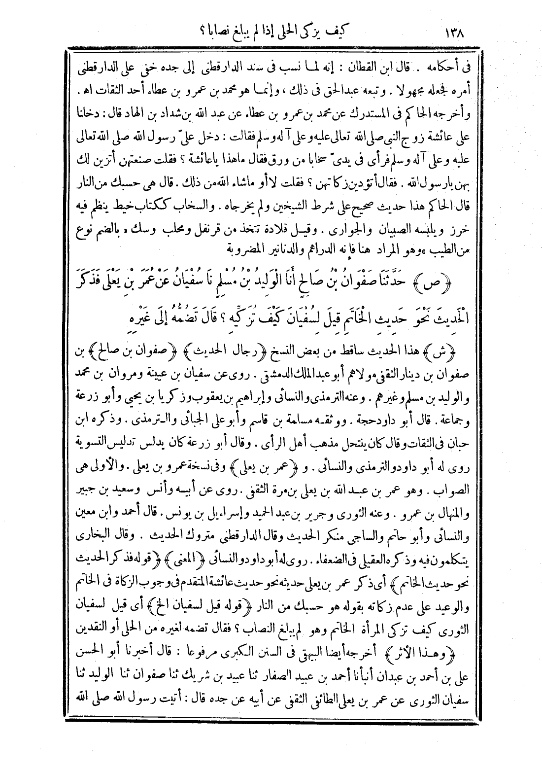 وأخرجه الحاكم في المستدرك عن محمَّد بن عمرو بن عطاء عن عبد الله بن شداد بن الهاد قال. دخلنا على عائشة زوج النبي صلى الله تعالى عليه وعلى آله وسلم فقالت: دخل عليّ رسول الله صلى الله تعالى عليه وعلى آله وسلم فرأى في يدىّ سخابا من ورق فقال ما هذا يا عائشة؟ فقلت صنعتن أتزين لك بهن يا رسول الله. فقال أتؤدين زكاتهن؟ فقلت لا أو ما شاء الله من ذلك. قال هي حسبك من النار قال الحاكم هذا حديث صحيح على شرط الشيخين ولم يخرجاه. والسخاب ككتاب خيط ينظم فيه خرز ويلبنسه الصبيان والجواري. وقيل قلادة تتخذ من قرنفل ومحلب وسك "بالضم نوع من الطيب" والمراد هنا فإنه الدراهم والدنانير المضروبة