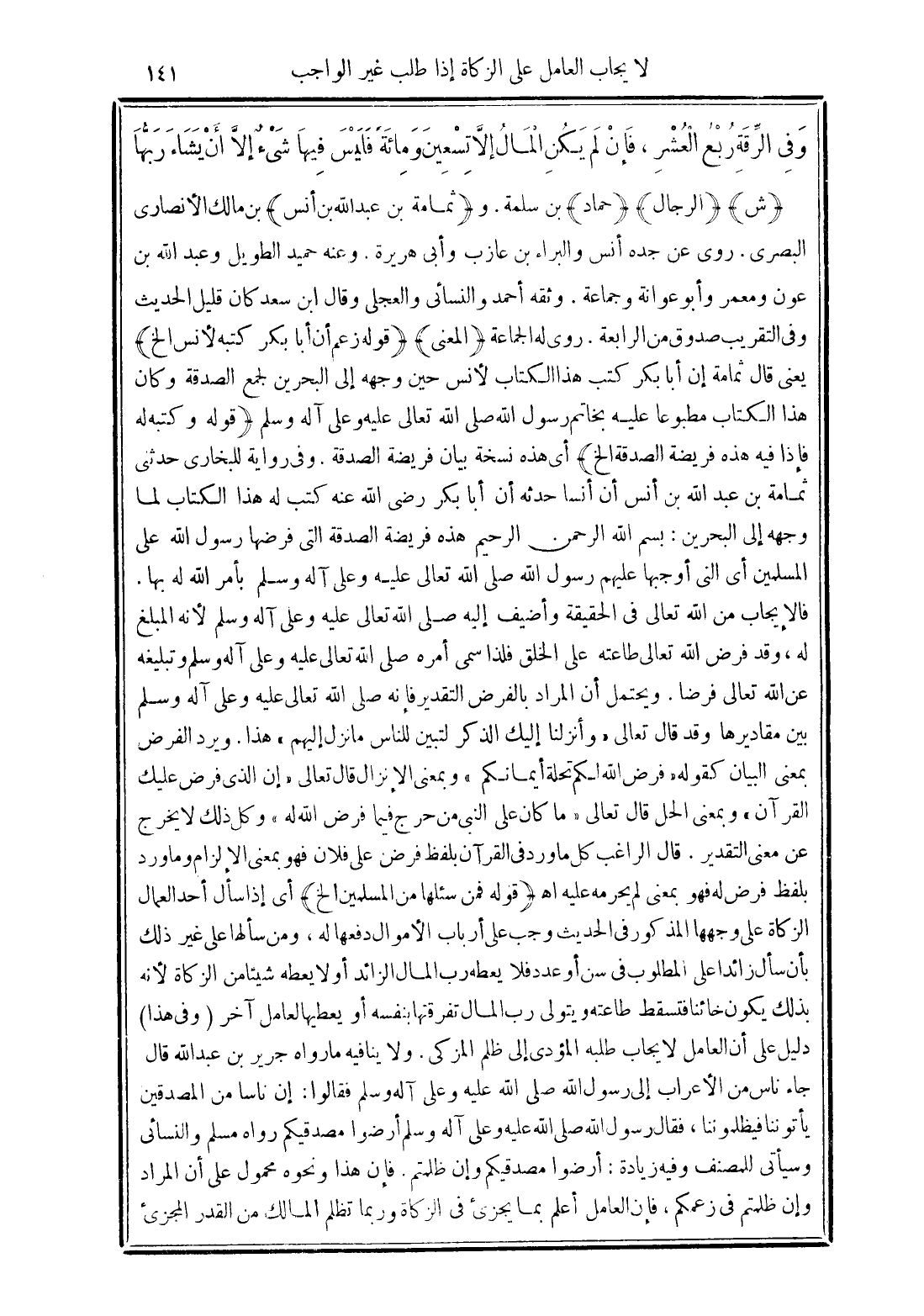 (قوله زعم أن أبا بكر كتبه لأنس الخ) يعني قال ثمامة إن أبا بكر كتب هذا الكتاب لأنس حين وجهه إلى البحرين لجمع الصدقة وكان هذا الكتاب مطبوعًا عليه بخاتم رسول الله صلى الله تعالى عليه وعلى آله وسلم