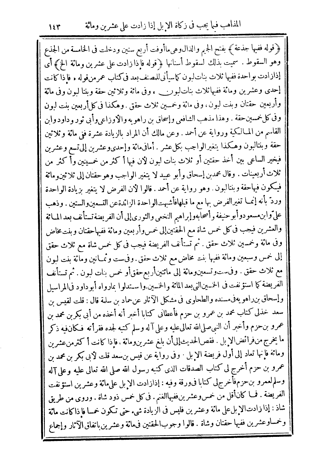أما في مائة وإحدى وعشرين إلى تسع وعشرين فيخير الساعي بين أخذ حقتين أو ثلاث بنات لبون لأن فيها أكثر من خمسينين وأكثر من ثلاث أربعينات. وقال محمَّد بن إسحاق وأبو عبيد لا يتغير الواجب وهو حقتان إلى ثلاثين ومائة فيكون فيها حقة وبنتا لبون وهو رواية عن أحمد. قالوا لأن الفرض لا يتغير بزيادة الواحدة وردّ بأنه إنما تغير الفرض بها مع ما قبلها فأشبهت الواحدة الزائدة عن التسعين والستين. وذهب علي وابن مسعود وأبو حنيفة وأصحابه وإبراهيم النخعي والثوري إلى أن الفريضة تستأنف بعد المائة والعشرين فيجب في كل خمس شاة مع الحقتين إلى خمس وأربعين ومائة ففيها حقتان وبنت مخاض وفي مائة وخمسين ثلاث حقق. ثم تستأنف الفريضة فيجب في كل خمس شاة مع ثلاث حقق إلى خمس وسبعين ومائة ففيها بنت مخاض مع ثلاث حقق. وفي ست وثمانين ومائة بنت لبون مع ثلاث حقق. وفي ست وتسعين ومائة إلى مائتين أربع حقق أو خمس بنات لبون. ثم تستأنف الفريضة كما استؤنفت في الخمسين التي بعد المائة والخمسين واستدلوا بما رواه أبو داود في المراسيل وإسحاق بن راهويه في مسنده والطحاوي في مشكل الآثار عن حماد بن سلمة قال: قلت لقيس بن سعد خذ لي كتاب محمَّد بن عمرو بن حزم فأعطاني كتابًا أخبر أنه أخذه من أبي بكر بن محمَّد عمرو بن حزم وأخبر أن النبي صلى الله تعالى عليه وعلى آله وسلم كتبه لجده فقرأته فكان فيه ذكر ما يخرج من فرائض الإبل. فقص الحديث إلى أن بلغ عشرين ومائة، فإذا كانت أكثر من عشرين ومائة فإنها تعاد إلى أول فريضة الإبل.