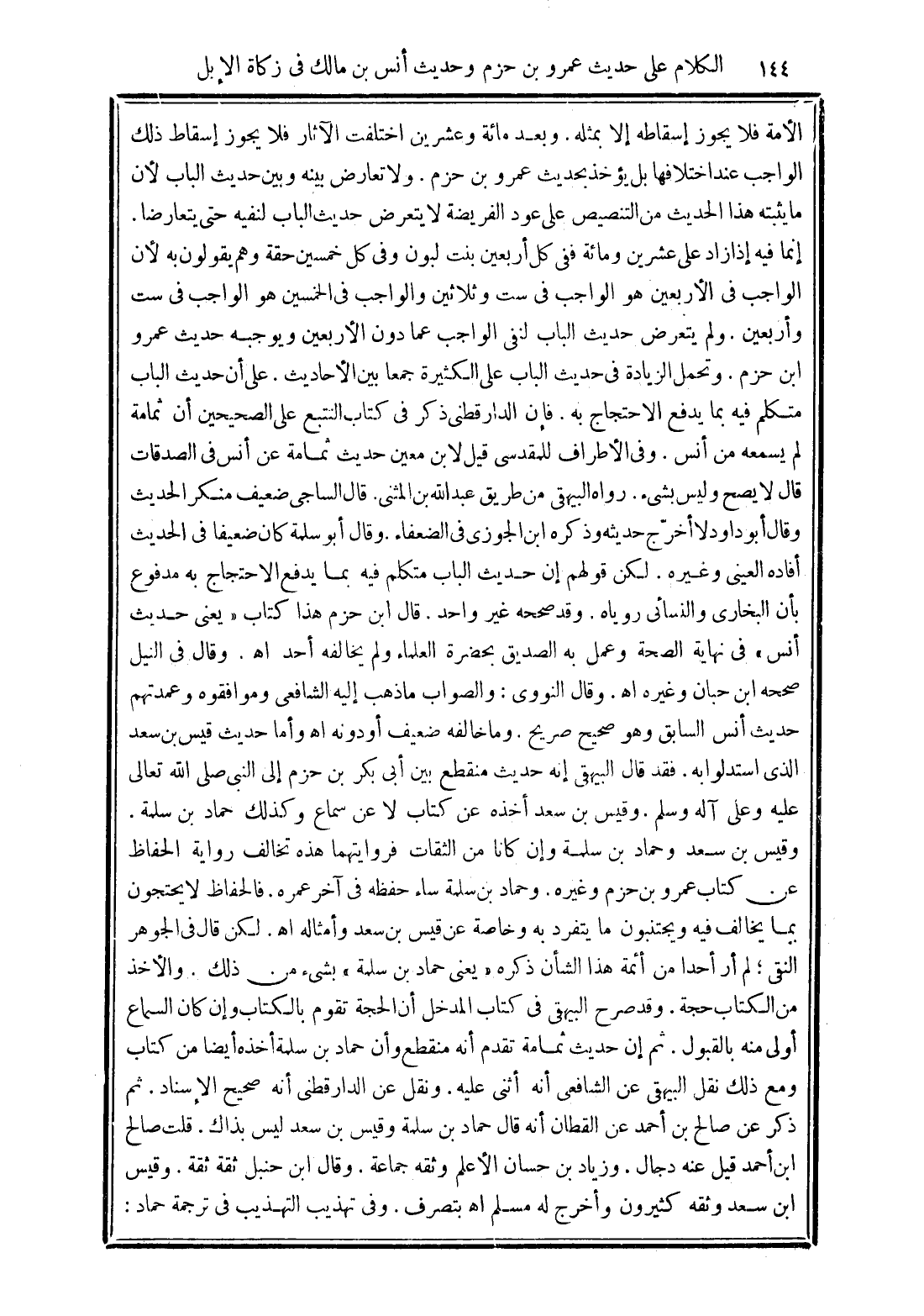 على أن حديث الباب متكلم فيه بما يدفع الاحتجاج به. فإن الدارقطني ذكر في كتاب التتبع على الصحيحين أن ثمامة لم يسمعه من أنس. وفي الأطراف للمقدسي قيل لابن معين حديث ثمامة عن أنس في الصدقات قال لا يصح وليس بشيء. رواه البيهقي من طريق عبد الله بن المثنى. قال الساجي ضعيف منكر الحديث وقال أبو داود لا أخرّج حديثه وذكره ابن الجوزى في الضعفاء. وقال أبو سلمة كان ضعيفًا في الحديث أفاده العيني وغيره. لكن قولهم إن حديث الباب متكلم فيه بما يدفع الاحتجاج به مدفوع بأن البخاري والنسائي روياه. وقد صححه غير واحد. قال ابن حزم هذا كتاب "يعني حديث أنس" في نهاية الصحة وعمل به الصديق بحضرة العلماء ولم يخالفه أحد اهـ. وقال في النيل صححه ابن حبان وغيره اهـ.