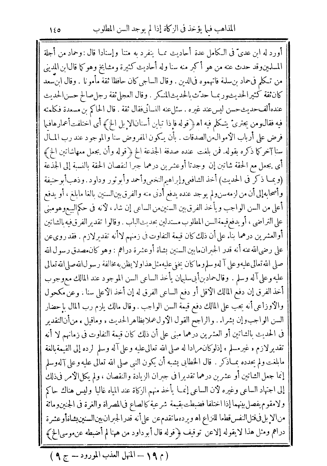 فقد روى عن علي رضي الله عنه أنه قدر الجبران ما بين السنين بشاة أو عشرة دراهم: وهو كان مصدق رسول الله صلى الله تعالى عليه وعلى آله وسلم وما كان يخفى عليه مثل هذا ولا يظن به مخالفة رسول الله صلى الله تعالى عليه وعلى آله وسلم. وقال حماد بن أبي سليمان يأخذ الساعي السن الموجود عند المالك مع وجوب أخذ الفرق إن دفع المالك الأقل أو دفع الساعي الفرق له إن أخد الأعلى سنًا. وعن مكحول والأوزاعي أنه يجب على المالك دفع قيمة السن الواجب. وقال مالك يلزم رب المال بإحضار السن الواجب وإن بشراء.