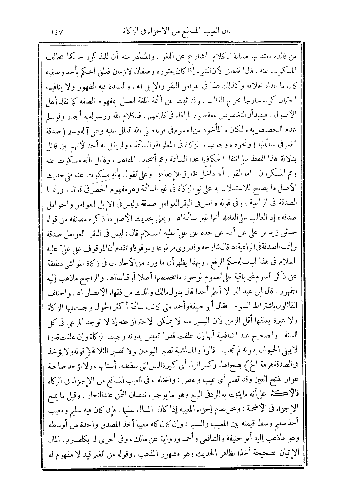 والعمدة فيه الظهور ولا ينافيه احتمال كونه خارجًا مخرج الغالب. وقد ثبت عن أئمة اللغة العمل بفهوم الصفة كما نقلة له أهل الأصول. فيفيد أن التخصيص به مقصود للبلغاء في كلامهم. فكلام الله ورسوله به أجدر لو سلم عدم التخصيص به "لكان" المأخوذ من العموم في قوله صلى الله تعالى عليه وعلى آله وسلم (صدقة الغنم في سائمتها) ونحوه "وجوب" الزكاة في المعلوفة والسائمة، ولم يقل به أحد لأنهم بين قائل بدلالة هذا اللفظ على انتفاء الحكم فيما عدا السائمة وهم أصحاب المفاهيم، وقائل بأنه مسكوت عنه وهم المنكرون. أما القول بأنه داخل فخارق للإجماع. وعلى القول بأنه مسكوِت عنه ففي حديث الأصل ما يصلح للاستدلال به على نفي الزكاة في غير السائمة وهو مفهوم الحصر في قوله "وإنما الصدقة في الراعية" وفي قوله "ليس في البقر العوامل صدقة وليس في الإبل العوامل والحوامل صدقة" إذ الغالب على العاملة أنها غير سائمة اهـ.