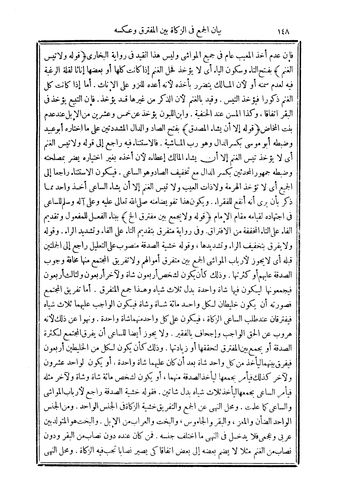 فقوله خشية الصدقة راجع لأرباب المواشي والساعى كما علمت. ومحل النهى عن الجمع والتفريق خشية الزكاة في الجنس الواحد. ومن الجنس الواحد الضأن والمعز، والبقر والجاموس، والبخت والعراب من الإبل. والبخت هو المتولد بين عربي وعجمي فلا يدخل في ما اختلف جنسه فمن كان عنده دون نصاب من البقر ودون نصاب من الغنم مثلًا لا يضم بعضه إلى بعض اتفاقًا كى يصير نصابًا تجب فيه الزكاة. ومحل النهي