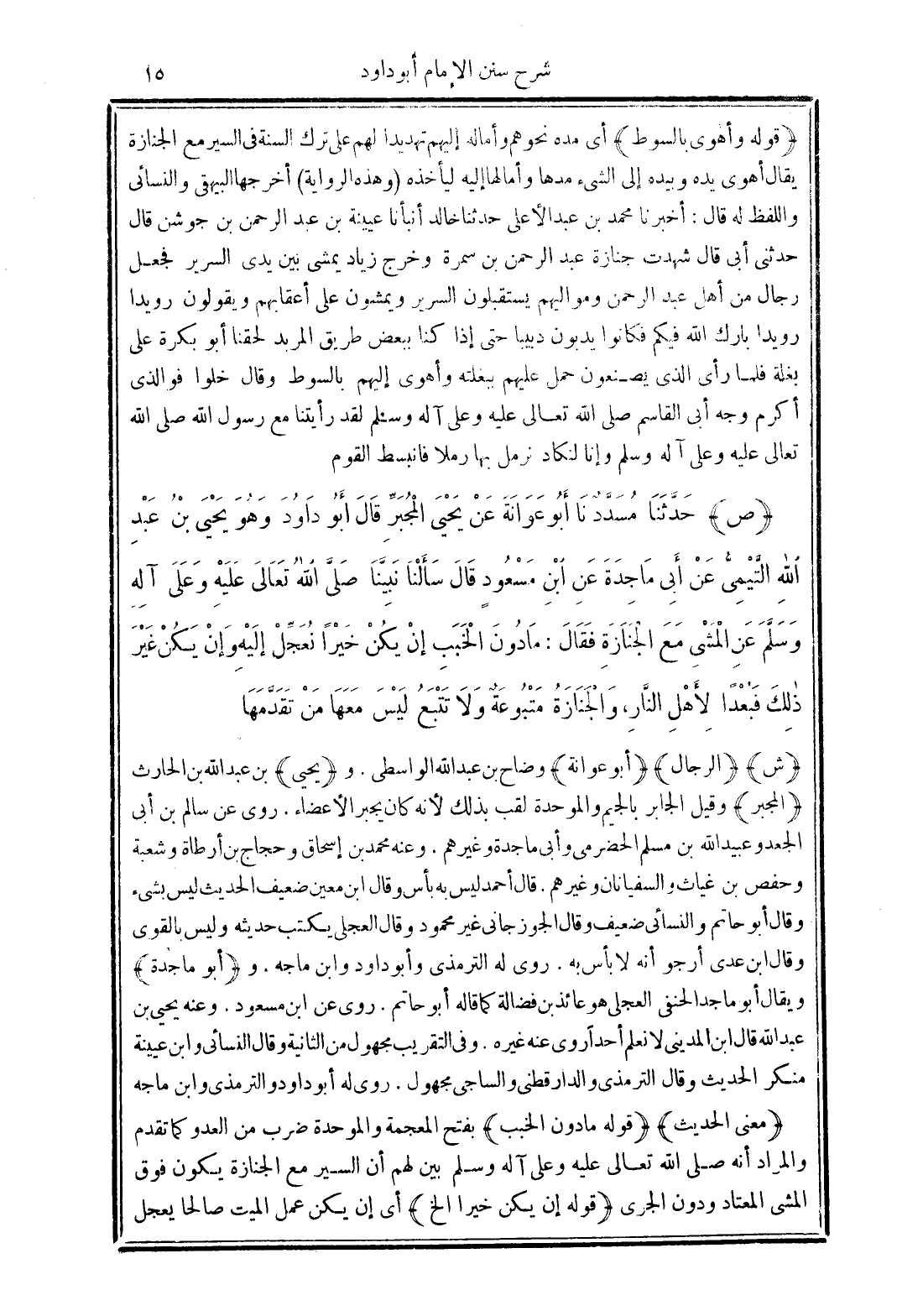 (ص) حَدَّثَنَا مُسَدَّدٌ نَا أَبُو عَوَانَةَ عَنْ يَحْيَى الْمُجَبِّرِ -قَالَ أَبُو دَاوُدَ وَهُوَ يَحْيَى بْنُ عَبْدِ اللَّهِ التَّيْمِيُّ- عَنْ أَبِي مَاجِدَةَ عَنِ ابْنِ مَسْعُودٍ قَالَ سَأَلْنَا نَبِيَّنَا -صَلَّى الله تَعَالَى عَلَيْهِ وَعَلَى آلِهِ وَسَلَّمَ- عَنِ الْمَشْيِ مَعَ الْجَنَازَةِ فَقَالَ "مَا دُونَ الْخَبَبِ إِنْ يَكُنْ خَيْرًا تَعَجَّلْ إِلَيْهِ وَإِنْ يَكُنْ غَيْرَ ذَلِكَ فَبُعْدًا لأَهْلِ النَّارِ وَالْجَنَازَةُ مَتْبُوعَةٌ وَلاَ تُتْبَعُ لَيْسَ مَعَهَا مَنْ تَقَدَّمَهَا".
