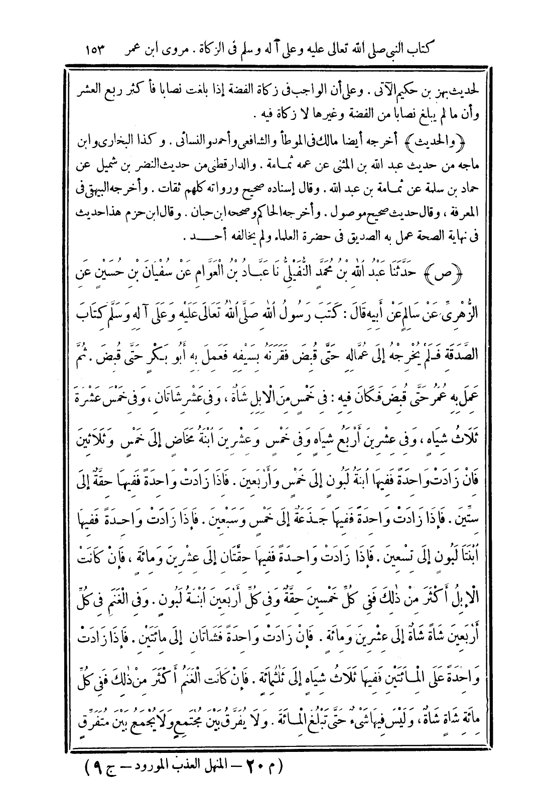 لحديث بهز بن حكيم الآتي. وعلى أن الواجب في زكاة الفضة إذا بلغت نصابًا فأكثر ربع العشر وأن ما لم يبلغ نصابًا من الفضة وغيرها لا زكاة فيه.
