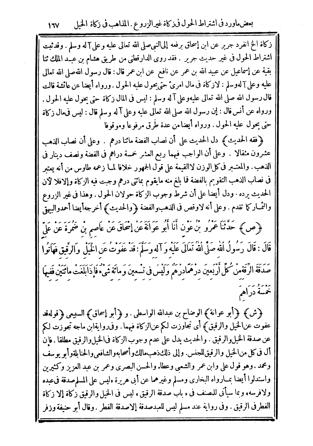 (ص) حَدَّثَنَا عَمْرُو بْنُ عَوْنٍ أَنَا أَبُو عَوَانَةَ عَنْ أَبِي إِسْحَاقَ عَنْ عَاصِمِ بْنِ ضَمْرَةَ عَنْ عَلِيٍّ عَلَيْهِ السَّلاَمُ قَالَ قَالَ رَسُولُ اللَّهِ -صَلَّى الله تَعَالَى عَلَيْهِ وَعَلَى آلِهِ وَسَلَّمَ- "قَدْ عَفَوْتُ عَنِ الْخَيْلِ وَالرَّقِيقِ فَهَاتُوا صَدَقَةَ الرِّقَةِ مِنْ كُلِّ أَرْبَعِينَ دِرْهَمًا دِرْهَمٌ وَلَيْسَ فِي تِسْعِينَ وَمِائَةٍ شَيْءٌ فَإِذَا بَلَغَتْ مِائَتَيْنِ فَفِيهَا خَمْسَةُ دَرَاهِمَ".