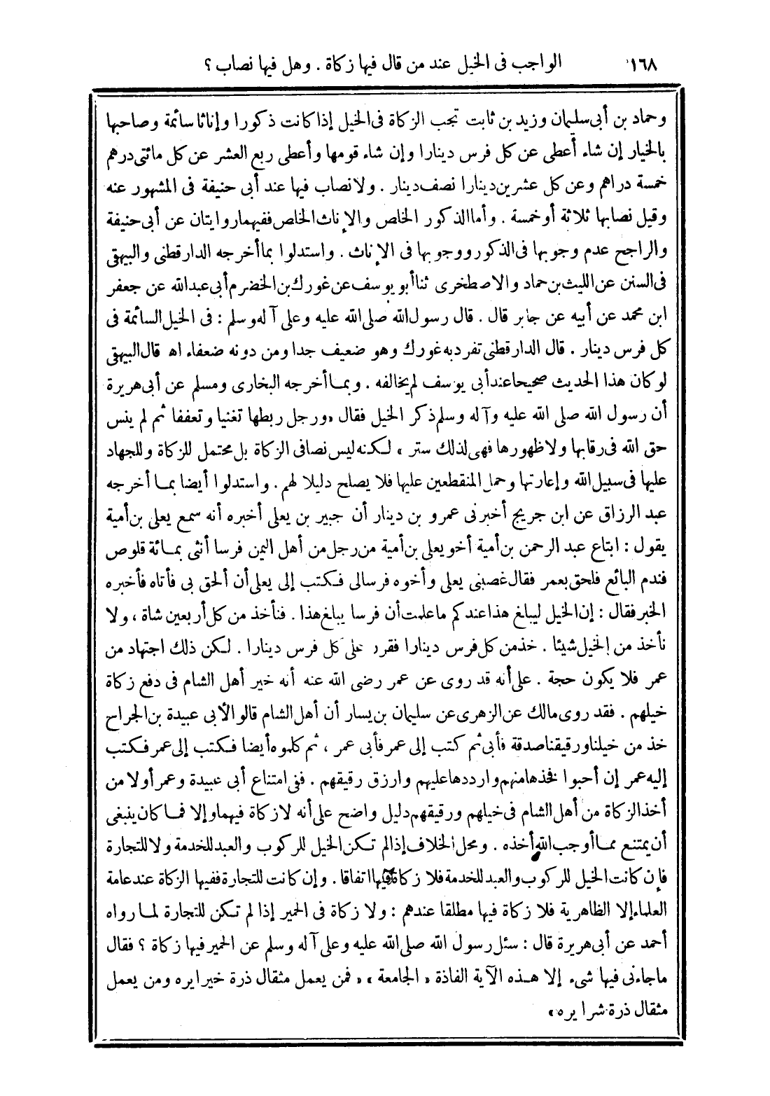قال البيهقي لو كان هذا الحديث صحيحًا عند أبي يوسف لم يخالفه. وبما أخرجه البخاري ومسلم عن أبي هريرة أن رسول الله صلى الله عليه وآله وسلم ذكر الخيل فقال "ورجل ربطها تغنيًا وتعففًا ثم لم ينس حق الله في رقابها ولا ظهورها فهي لذلك ستر" لكنه ليس نصًا في الزكاة بل محتمل للزكاة وللجهاد عليها في سبيل الله وإعارتها وحمال المنقطعين عليها فلا يصلح دليلًا لهم.