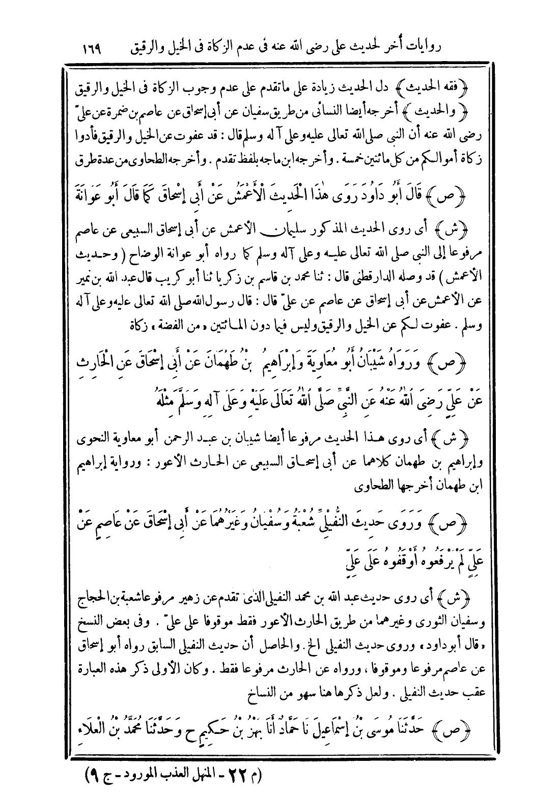 (ش) أي روى هذا الحديث مرفوعًا أيضًا شيبان بن عبد الرحمن أبو معاوية النحوي وإبراهيم بن طهمان كلاهما عن أبي إسحاق السبيعي عن الحارث الأعور: ورواية إبراهيم ابن طهمان أخرجها الطحاوي