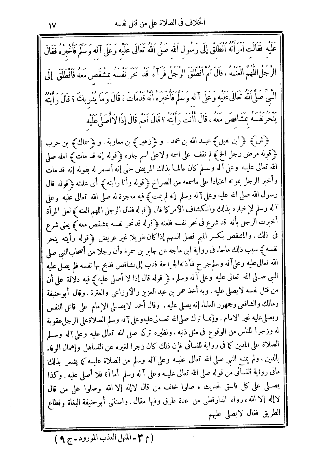 عَلَيْهِ فَقَالَتِ امْرَأَتُهُ انْطَلِقْ إِلَى رَسُولِ اللَّهِ -صَلَّى الله تَعَالَى عَلَيْهِ وَعَلَى آلِهِ وَسَلَّمَ- فَأَخْبِرْهُ. فَقَالَ الرَّجُلُ اللَّهُمَّ الْعَنْهُ. قَالَ ثُمَّ انْطَلَقَ الرَّجُلُ فَرَآهُ قَدْ نَحَرَ نَفْسَهُ بِمِشْقَصٍ مَعَهُ فَانْطَلَقَ إِلَى النَّبِيِّ -صَلَّى الله تَعَالَى عَلَيْهِ وَعَلَى آلِهِ وَسَلَّمَ- فَأَخْبَرَهُ أَنَّهُ قَدْ مَاتَ فَقَالَ "مَا يُدْرِيكَ". قَالَ رَأَيْتُهُ يَنْحَرُ نَفْسَهُ بِمَشَاقِصَ مَعَهُ. قَالَ "أَنْتَ رَأَيْتَهُ". قَالَ نَعَمْ. قَالَ "إِذًا لاَ أُصَلِّي عَلَيْهِ".