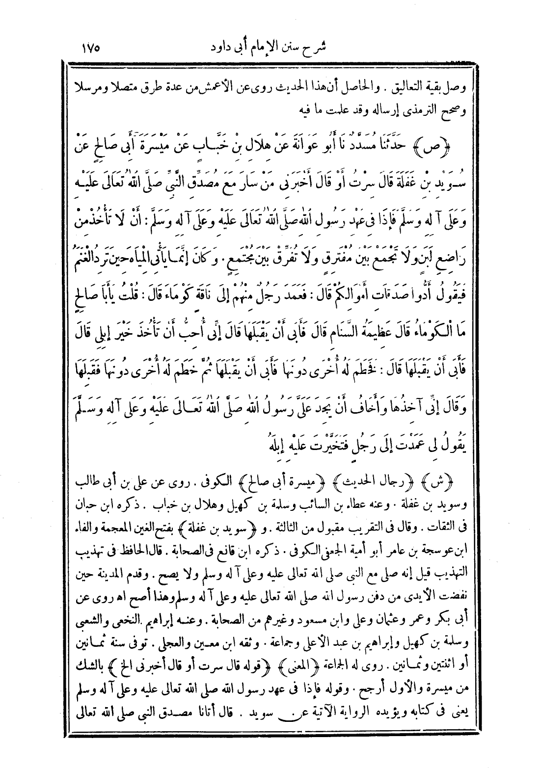 (ص) حَدَّثَنَا مُسَدَّدٌ نَا أَبُو عَوَانَةَ عَنْ هِلاَلِ بْنِ خَبَّابٍ عَنْ مَيْسَرَةَ أَبِي صَالِحٍ عَنْ سُوَيْدِ بْنِ غَفَلَةَ قَالَ سِرْتُ أَوْ قَالَ أَخْبَرَنِي مَنْ سَارَ مَعَ مُصَدِّقِ النَّبِيِّ -صَلَّى الله تَعَالَى عَلَيْهِ وَعَلَى آلِهِ وَسَلَّمَ- فَإِذَا فِي عَهْدِ رَسُولِ اللَّهِ -صَلَّى الله تَعَالَى عَلَيْهِ وَعَلَى آلِهِ وَسَلَّمَ- "أَنْ لاَ تَأْخُذْ مِنْ رَاضِعِ لَبَنٍ وَلاَ تَجْمَعْ بَيْنَ مُفْتَرِقٍ وَلاَ تُفَرِّقْ بَيْنَ مُجْتَمِعٍ". وَكَانَ إِنَّمَا يَأْتِي الْمِيَاهَ حِينَ تَرِدُ الْغَنَمُ فَيَقُولُ أَدُّوا صَدَقَاتِ أَمْوَالِكُمْ. قَالَ فَعَمَدَ رَجُلٌ مِنْهُمْ إِلَى نَاقَةٍ كَوْمَاءَ -قَالَ- قُلْتُ يَا أَبَا صَالِحٍ مَا الْكَوْمَاءُ قَالَ عَظِيمَةُ السَّنَامِ -قَالَ- فَأَبَى أَنْ يَقْبَلَهَا قَالَ إِنِّي أُحِبُّ أَنْ تَأْخُذَ خَيْرَ إِبِلِي. قَالَ فَأَبَى أَنْ يَقْبَلَهَا قَالَ فَخَطَمَ لَهُ أُخْرَى دُونَهَا فَأَبَى أَنْ يَقْبَلَهَا ثُمَّ خَطَمَ لَهُ أُخْرَى دُونَهَا فَقَبِلَهَا وَقَالَ إِنِّي آخِذُهَا وَأَخَافُ أَنْ يَجِدَ عَلَيَّ رَسُولُ اللَّهِ -صَلَّى الله تَعَالَى عَلَيْهِ وَعَلَى آلِهِ وَسَلَّمَ- يَقُولُ لِي عَمَدْتَ إِلَى رَجُلٍ فَتَخَيَّرْتَ عَلَيْهِ إِبِلَهُ.