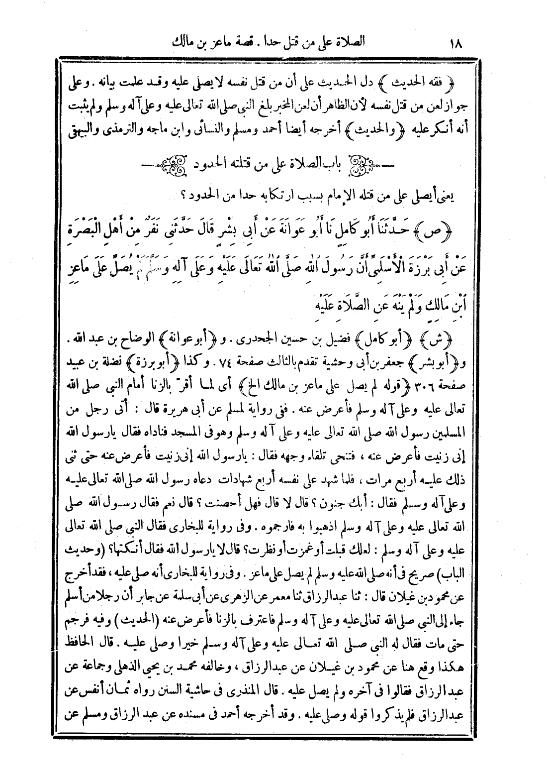 (قوله لم يصل على ماعز بن مالك آلخ) أي لما أقرّ بالزنا أمام النبي صلى الله تعالى وعلى آله وسلم فأعرض عنه. ففي رواية لمسلم عن أبي هريرة قال: أتى رجل من المسلمبن رسول الله صلى الله تعالى عليه وعلى آله وسلم وهو في المسجد فناداه فقال يا رسول الله إني زنيت فأعرض عنه، فتنحى تلقاء وجه فقال: يا رسول الله إني زنيت فأعرض عنه حتى ثنى ذلك عليه أربع مرات، فلما شهد على نفسه أربع شهادات دعاه رسول الله صلى الله تعالى عليه وعلى آله وسلم فقال: أبك جنون؟ قال لا قال فهل أحصنت؟ قال نعم فقال رسول الله صلى الله تعالى عليه وعلى آله وسلم اذهبوا به فارجموه.