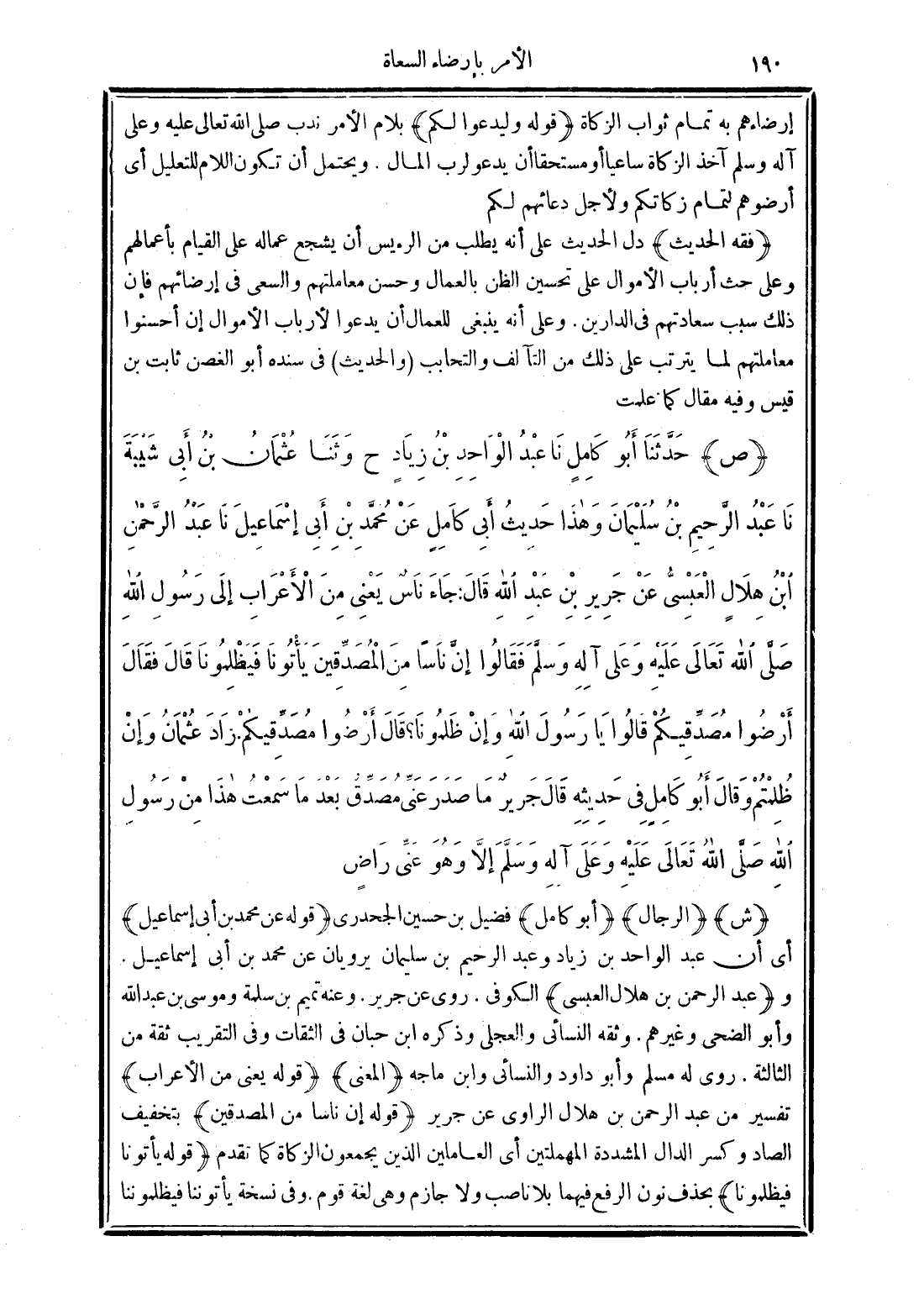 (ص) حَدَّثَنَا أَبُو كَامِلٍ نَا عَبْدُ الْوَاحِدِ يَعْنِي ابْنَ زِيَادٍ ح وَنَا عُثْمَانُ بْنُ أَبِي شَيْبَةَ نَا عَبْدُ الرَّحِيمِ بْنُ سُلَيْمَانَ -وَهَذَا حَدِيثُ أَبِي كَامِلٍ- عَنْ مُحَمَّدِ بْنِ أَبِي إِسْمَاعِيلَ نَا عَبْدُ الرَّحْمَنِ بْنُ هِلاَلٍ الْعَبْسِيُّ عَنْ جَرِيرِ بْنِ عَبْدِ اللَّهِ قَالَ جَاءَ نَاسٌ -يَعْنِي مِنَ الأَعْرَابِ- إِلَى رَسُولِ اللَّهِ -صَلَّى الله تَعَالَى عَلَيْهِ وَعَلَى آلِهِ وَسَلَّمَ- فَقَالُوا إِنَّ نَاسًا مِنَ الْمُصَدِّقِينَ يَأْتُونَا فَيَظْلِمُونَا. قَالَ فَقَالَ "أَرْضُوا مُصَدِّقِيكُمْ". قَالُوا يَا رَسُولَ اللَّهِ وَإِنْ ظَلَمُونَا قَالَ "أَرْضُوا مُصَدِّقِيكُمْ". زَادَ عُثْمَانُ "وَإِنْ ظُلِمْتُمْ". قَالَ أَبُو كَامِلٍ فِي حَدِيثِهِ قَالَ جَرِيرٌ مَا صَدَرَ عَنِّي مُصَدِّقٌ بَعْدَ مَا سَمِعْتُ هَذَا مِنْ رَسُولِ اللَّهِ -صَلَّى الله تَعَالَى عَلَيْهِ وَعَلَى آلِهِ وَسَلَّمَ- إِلاَّ وَهُوَ عَنِّي رَاضٍ.