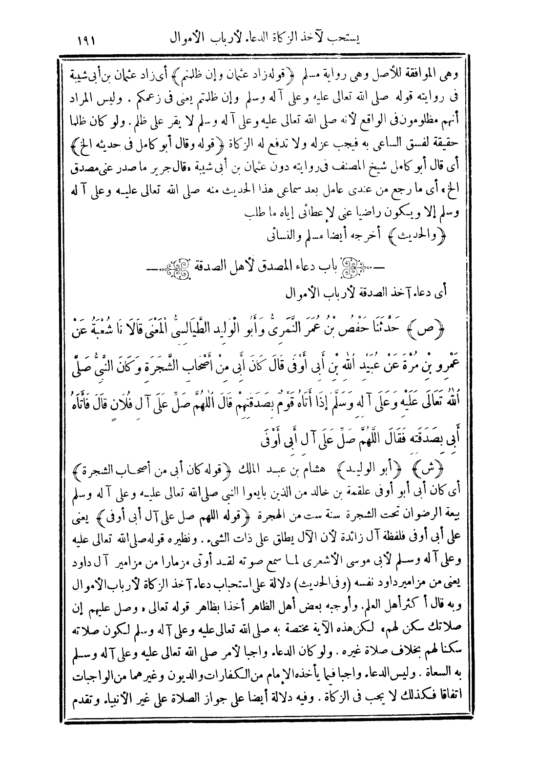 (وفي الحديث) دلالة على استجاب دعاء آخذ الزكاة لأرباب الأموال وبه قال أكثر أهل العلم. وأوجبه بعض أهل الظاهر أخذًا بظاهر قوله تعالى (وَصَلِّ عَلَيْهِمْ إِنَّ صَلَاتَكَ سَكَنٌ لَهُمْ) لكن هذه الآية مختصة به صلى الله تعالى عليه وعلى آله وسلم لكون صلاته سكنًا لهم بخلاف صلاة غيره. ولو كان الدعاء واجبًا لأمر صلى الله تعالى عليه وعلى آله وسلم به السعاة. وليس الدعاء واجبًا فيما يأخذه الإِمام من الكفارات والديون وغيرهما من الواجبًات اتفاقًا فكذلك لا يجب في الزكاة. وفيه دلالة أيضًا علي جواز الصلاة علي غير الأنبياء وتقدم