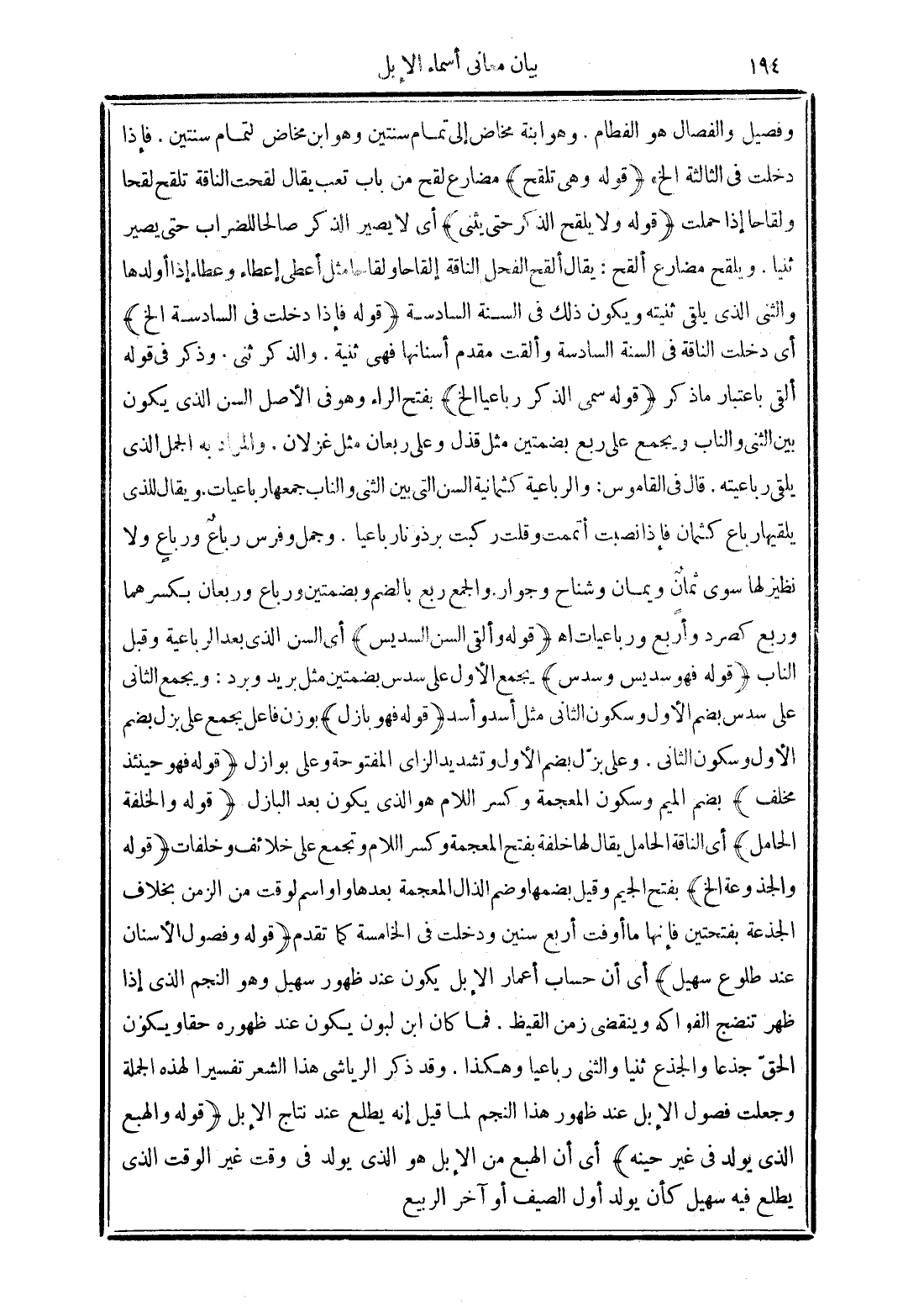 (قوله وفصول الأسنان عند طلوع سهيل) أي أن حساب أعمار الإبل يكون عند ظهور سهيل وهو النجم الذي إذا ظهر تنضج الفواكه وينقضي زمن القيظ. فما كان ابن لبون يكون عند ظهوره حقًا ويكون الحقّ جذعًا والجذع ثنيًا والثني رباعيًا وهكذا. وقد ذكر الرياشي هذا الشعر تفسيرًا لهذه الجملة وجعلت فصول الإبل عند ظهور هذا النجم لما قيل إنه يطلع عند نتاج الإبل