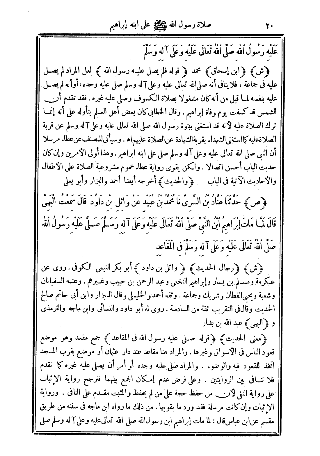 (ص) حَدَّثَنَا هَنَّادُ بْنُ السَّرِيِّ نَا مُحَمَّدُ بْنُ عُبَيْدٍ عَنْ وَائِلِ بْنِ دَاوُدَ قَالَ سَمِعْتُ الْبَهِيَّ قَالَ لَمَّا مَاتَ إِبْرَاهِيمُ ابْنُ النَّبِيِّ -صَلَّى الله تَعَالَى عَلَيْهِ وَعَلَى آلِهِ وَسَلَّمَ- صَلَّى عَلَيْهِ رَسُولُ اللَّهِ -صَلَّى الله تَعَالَى عَلَيْهِ وَعَلَى آلِهِ وَسَلَّمَ- فِي الْمَقَاعِدِ.