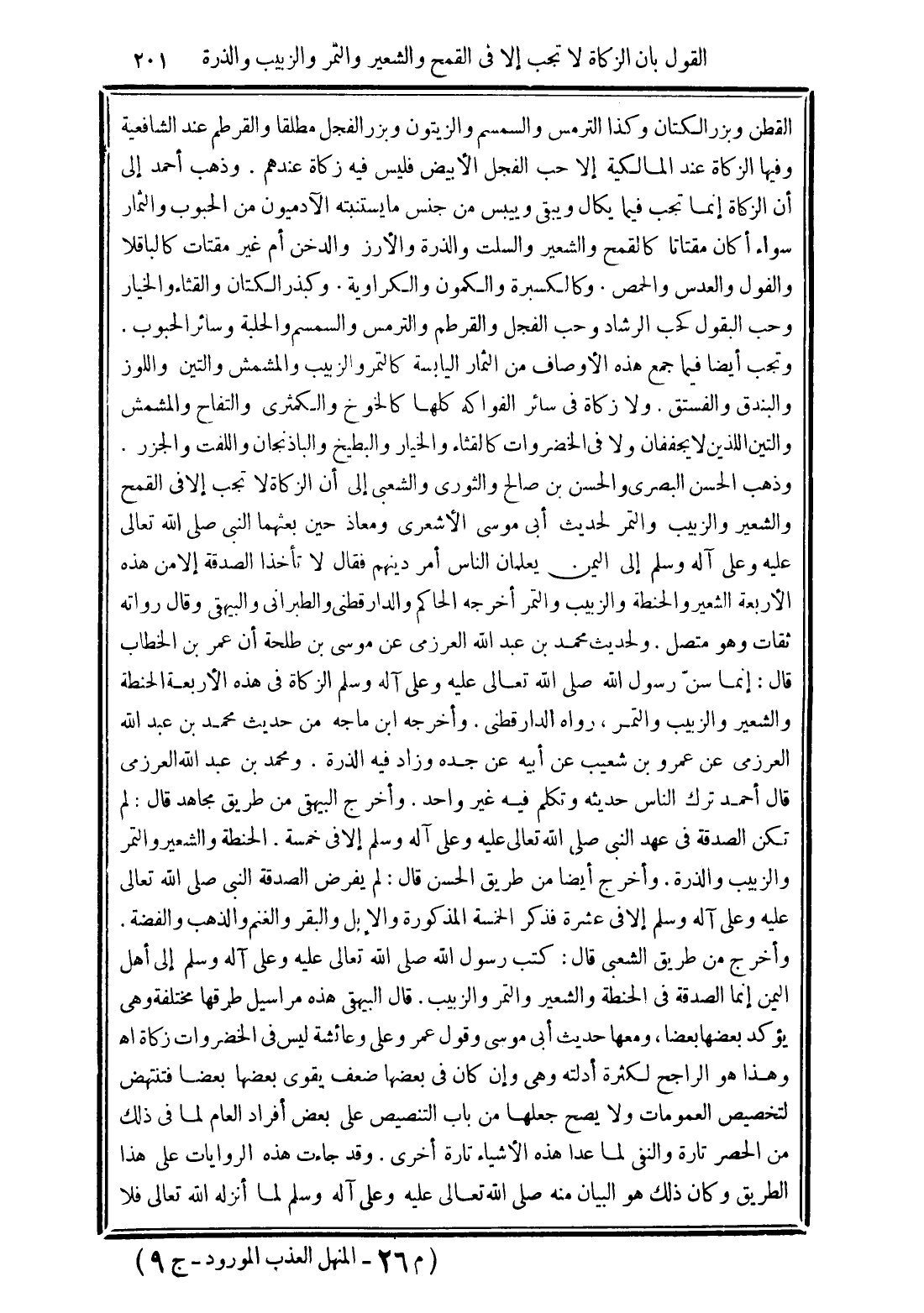 ولحديث محمد بن عبد الله العرزمي عن موسى بن طلحة أن عمر بن الخطاب قال: إنما سنّ رسول الله صلى الله تعالى عليه وعلى آله وسلم الزكاة في هذه الأربعة الحنطة والشعير والزبيب والتمر، رواه الدارقطني. وأخرجه ابن ماجه من حديث محمد بن عبد الله العرزمي عن عمرو بن شعيب عن أبيه عن جده وزاد فيه الذرة. ومحمد بن عبد الله العرزمي قال أحمد ترك الناس حديثه وتكلم فيه غير واحد. وأخرج البيهقي من طريق مجاهد قال: لم تكن الصدقة في عهد النبي الله تعالى عليه وعلى آله وسلم إلا في خمسة. الحنطة والشعير والتمر والزبيب والذرة. وأخرج أيضًا من طريق الحسن قال: لم يفرض الصدقة النبي صلى الله تعالى عليه وعلى آله وسلم إلا في عشرة فذكر الخمسة المذكورة والإبل والبقر والغنم والذهب والفضة.