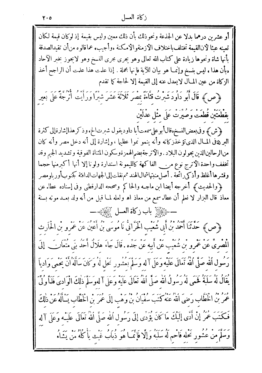 أو عشرين درهما بدلًا عن الجذعة ونحو ذلك بأن ذلك معين وليس بقيمة إذ لو كان قيمة لكان تعينه عبثًا لأن القيمة تختلف باختلاف الأزمنة والأمكنة "وأجيب" عما قالوه من أن تقيد الصدقة بأنها شاة ونحوها زيادة على كتاب الله تعالى وهو يجري مجرى النسخ وهو لا يجوز بخبر الآحاد "بأن هذا" ليس بنسخ وإنما هو بيان للآية فإنها مجملة. إذا علمت هذا علمت أن الراجح أخذ الزكاة من عين المال لا يعدل عنه إلى القيمة إلا لحاجة كما تقدم