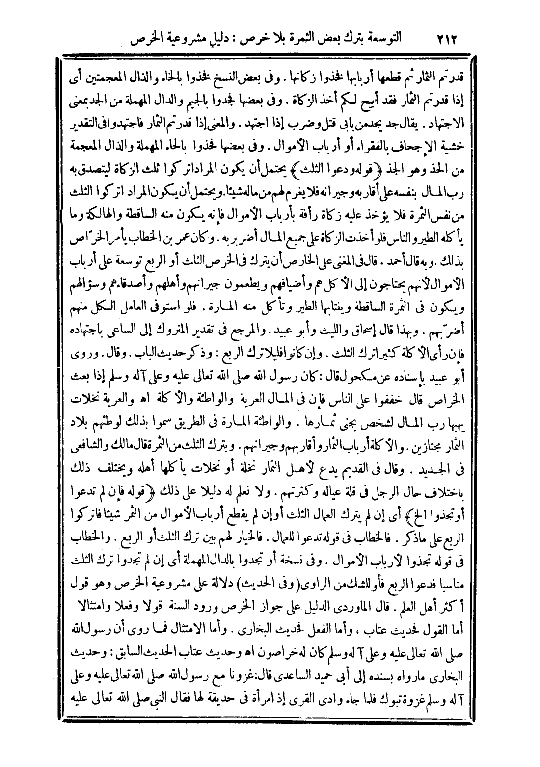 (قوله ودعوا الثلث) يحتمل أن يكون المراد اتركوا ثلث الزكاة ليتصدق به رب المال بنفسه على أقاربه وجيرانه فلا يغرم لهم من ماله شيئًا. ويحتمل أن يكون المراد اتركوا الثلث من نفس الثمرة فلا يؤخذ عليه زكاة رأفة بأرباب الأموال فإنه يكون منه الساقطة والهالكة وما يأكله الطير والناس فلو أخذت الزكاة على جميع المال أضر بربه. وكان عمر بن الخطاب يأمر الخرّاص بذلك. وبه قال أحمد. قال في المغني على الخارص أن يترك في الخرص الثلث أو الربع توسعة على أرباب الأموال لأنهم يحتاجون إلى الأكل وأضيافهم ويطعمون جيرانهم وأهلهم وأصدقاءهم وسؤالهم ويكون في الثمرة الساقطة وينتابها الطير وتأكل منه المارة. فلو استوفى العامل الكل منهم أضرّ بهم. وبهذا قال إسحاق والليث وأبو عبيد. والمرجع في تقدير المتروك إلى الساعي باجتهاده فإن رأى الأكلة كثيرًا ترك الثلث. وإن كانوا قليلًا ترك الربع: وذكر حديث الباب. وقال. وروى أبو عبيد بإسناده عن مكحول قال: كان رسول الله صلى الله تعالى عليه وعلى آله وسلم إذا بعث الخراص قال خففوا على الناس فإن في المال العرية والواطئة والأكلة اهـ