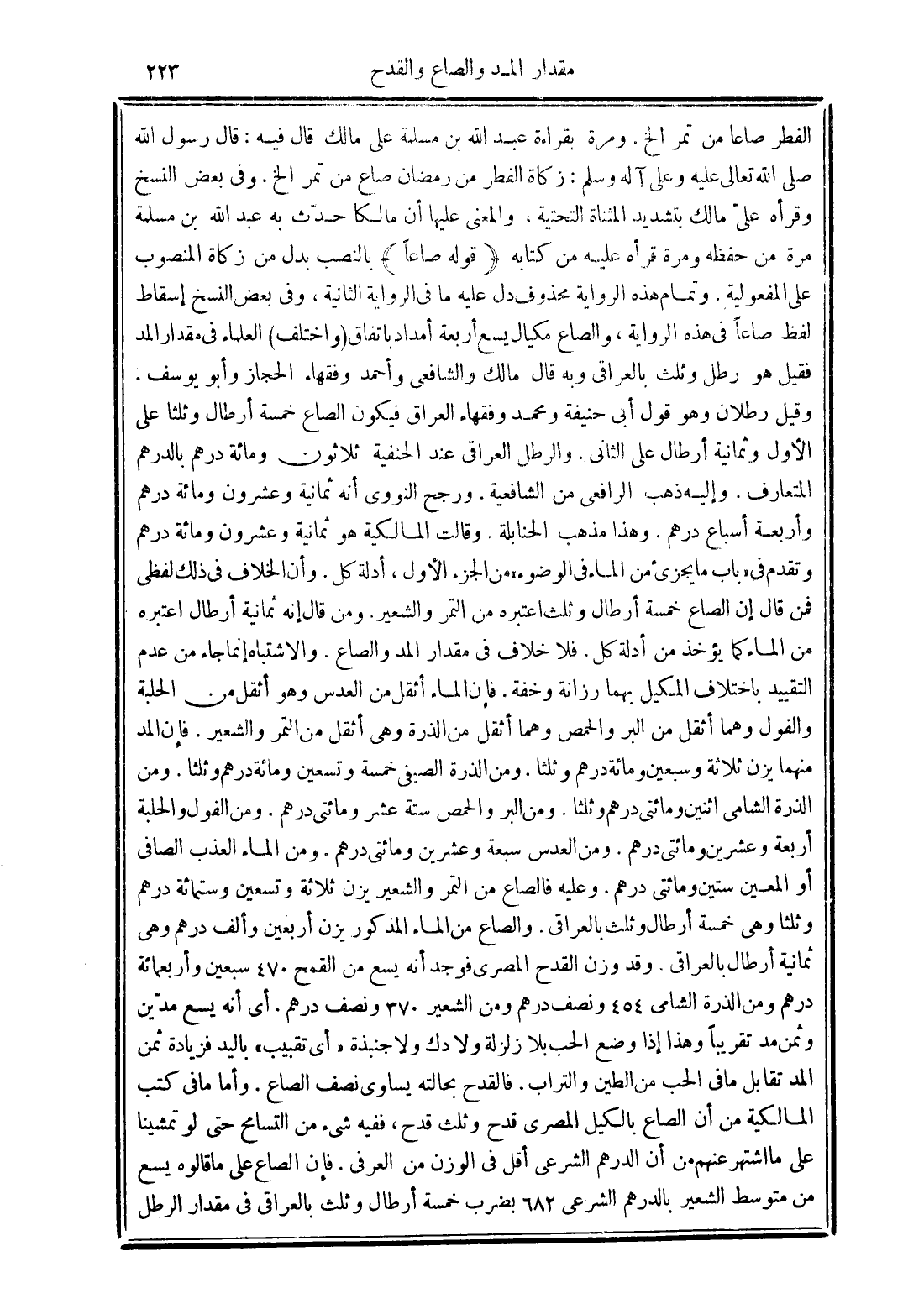 (واختلف) العلماء في مقدار المد فقيل هو رطل وثلث بالعراقي وبه قال مالك والشافعي وأحمد وفقهاء الحجاز وأبو يوسف. وقيل رطلان وهو قول أبي حنيفة ومحمد وفقهاء العراق فيكون الصاع خمسة أرطال وثلثًا على الأول وثمانية أرطال على الثاني. والرطل العراقي عند الحنفية ثلاثون ومائة درهم بالدرهم المتعارف. وإليه ذهب الرافعي من الشافعية. ورجح النووي أنه ثمانية وعشرون ومائة درهم وأربعة أسباع درهم. وهذا مذهب الحنابلة. وقالت المالكية هو ثمانية وعشرون ومائة درهم وتقدم في "باب ما يجزئ من الماء في الوضوء" من الجزء الأول، أدلة كل. وأن الخلاف في ذلك لفظي فمن قال إن الصاع خمسة أرطال وثلث اعتبره من التمر والشعير. ومن قال إنه ثمانية أرطال اعتبره من الماء كما يؤخذ من أدلة كل. فلا خلاف في مقدار المد والصاع. والاشتباه إنما جاء من عدم التقييد باختلاف المكيل بهما رزانة وخفة. فإن الماء أثقل من العدس وهو أثقل من الحلبة والفول وهما أثقل من البر والحمص وهما أثقل من الذرة وهي أثقل من التمر والشعير. فإن المد منهما يزن ثلاثة وسبعين ومائة درهم وثلثًا. ومن الذرة الصيفي خمسة وتسعين ومائة درهم وثلثًا. ومن الذرة الشامي اثنين ومائتي درهم وثلثًا. ومن البر والحمص ستة عشر ومائتي درهم. ومن القول والحلبة أربعة وعشرين ومائتي درهم. ومن العدس سبعة وعشرين ومائتي درهم. ومن الماء العذب الصافي أو المعين ستين ومائتي درهم. وعليه فالصاع من التمر والشعير يزن ثلاثة وتسعين وستمائة درهم وثلثًا وهي خمسة أرطال وثلث بالعراقي. والصاع من الماء المذكور يزن أربعين وألف درهم وهي ثمانية أرطال بالعراقي. وقد وزن القدح المصري فوجد أنه يسع من القمح 470 سبعين وأربعمائة درهم ومن الذرة الشامي 454 ونصف درهم ومن الشعير 370 ونصف درهم. أي أنه يسع مدّين وثمن مد تقريبًا وهذا إذا وضع الحب بلا زلزلة ولا دك ولا جنذة "أبي تقبيب" باليد فزيادة ثمن المد تقابل ما في الحب من الطين والتراب. فالقدح بحالته يساوى نصف الصاع. وأما ما في كتب المالكية من أن الصاع بالكيل المصري قدح وثلث قدح، ففيه شيء من التسامح حتى لو تمشينا على ما اشتهر عنهم من أن الدرهم الشرعي أقل في الوزن من العرفي. فإن الصاع على ما قالوه يسع من متوسط الشعير بالدرهم الشرعي 682 بضرب خمسة أرطال وثلث بالعراقي في مقدار الرطل