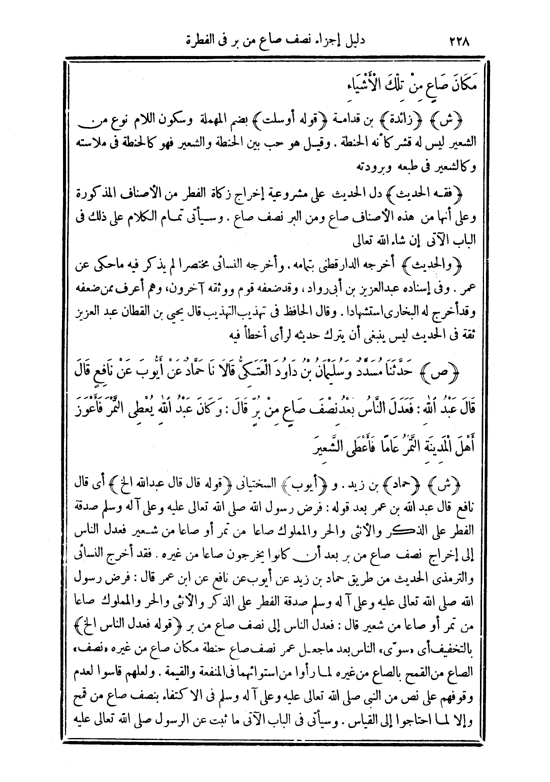 (ص) حَدَّثَنَا مُسَدَّدٌ وَسُلَيْمَانُ بْنُ دَاوُدَ الْعَتَكِيُّ قَالاَ نَا حَمَّادٌ عَنْ أَيُّوبَ عَنْ نَافِعٍ قَالَ قَالَ عَبْدُ اللَّهِ فَعَدَلَ النَّاسُ بَعْدُ نِصْفَ صَاعٍ مِنْ بُرٍّ. قَالَ وَكَانَ عَبْدُ اللَّهِ يُعْطِي التَّمْرَ فَأَعْوَزَ أَهْلَ الْمَدِينَةِ التَّمْرُ عَامًا فَأَعْطَى الشَّعِيرَ.