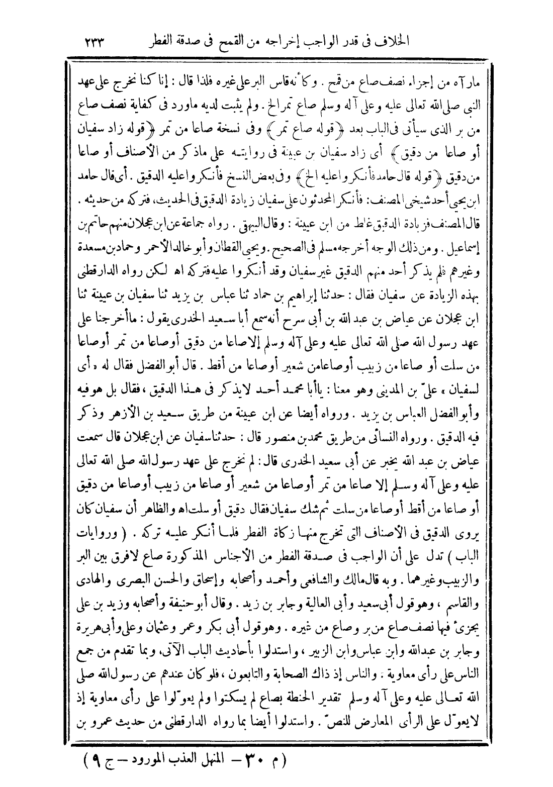 (وروايات الباب) تدل على أن الواجب في صدقة الفطر من الأجناس المذكورة صاع لا فرق بين البر والزبيب وغيرهما. وبه قال مالك والشافعي وأحمد وأصحابه وإسحاق والحسن البصرى والهادي والقاسم، وهو قول أبي سعيد وأبي العالية وجابر بن زيد. وقال أبو حنيفة وأصحابه وزيد بن على يجزئ فيها نصف صاع من بر وصاع من غيره. وهو قول أبي بكر وعمر وعثمان وعلي وأبي هريرة وجابر بن عبد الله وابن عباس وابن الزبير، واستدلوا بأحاديث الباب الآتي, وبما تقدم من جمع الناس على رأى معاوية. والناس إذ ذاك الصحابة والتابعون، فلو كان عندهم عن رسول الله صلى الله تعالى عليه وعلى آله وسلم تقدير الحنطة بصاع لم يسكتوا ولم يعوّلوا على رأي معاوية إذ لا يعوّل على الرأي المعارض للنصّ. واستدلوا أيضًا بما رواه الدارقطني من حديث عمرو بن