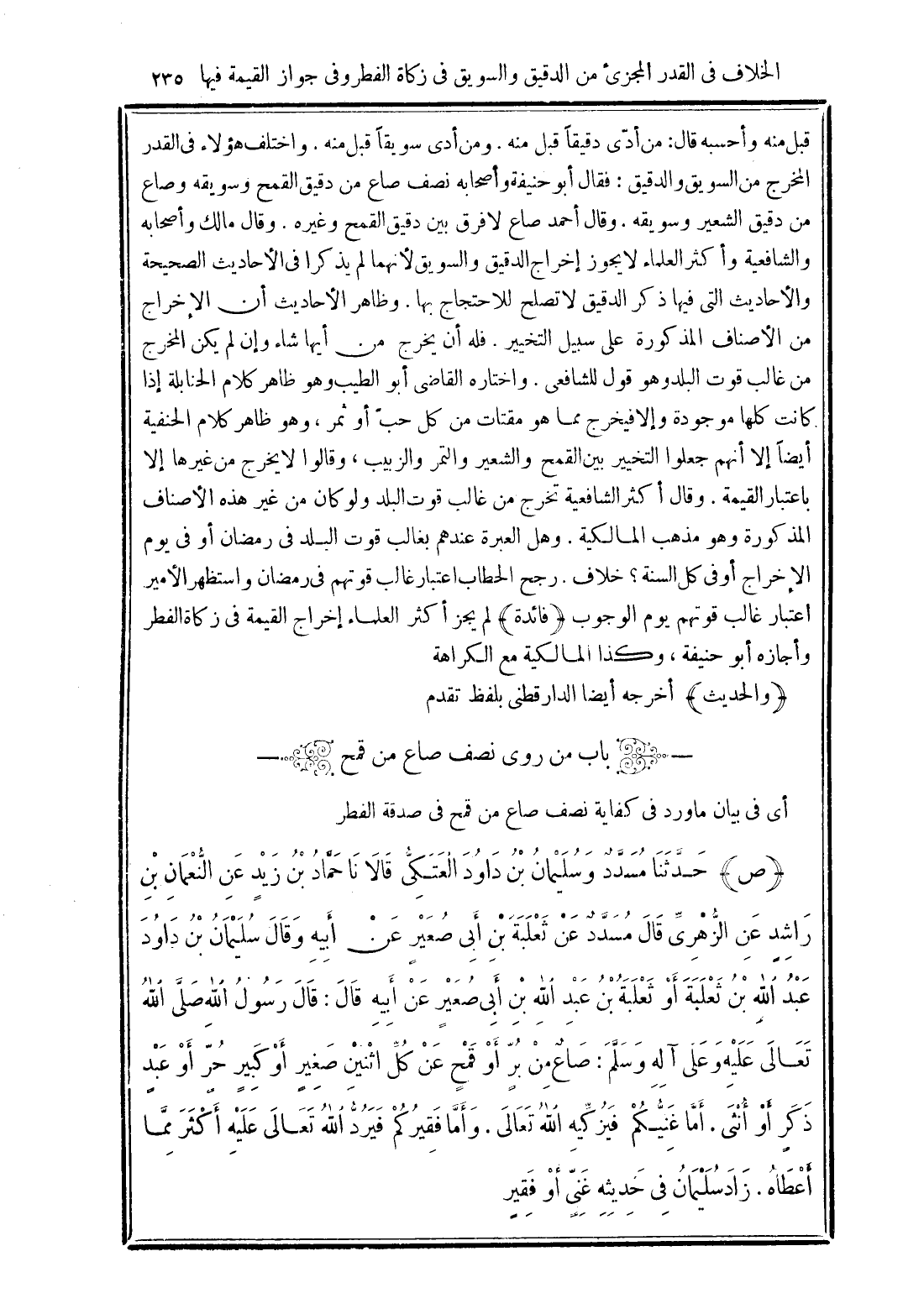 وقال أحمد صاع لا فرق بين دقيق القمح وغيره. وقال مالك وأصحابه والشافعية وأكثر العلماء لا يجوز إخراج الدقيق والسويق لأنهما لم يذكرا في الأحاديث الصحيحة والأحاديث التي فها ذكر الدقيق لا تصلح الاحتجاج بها.