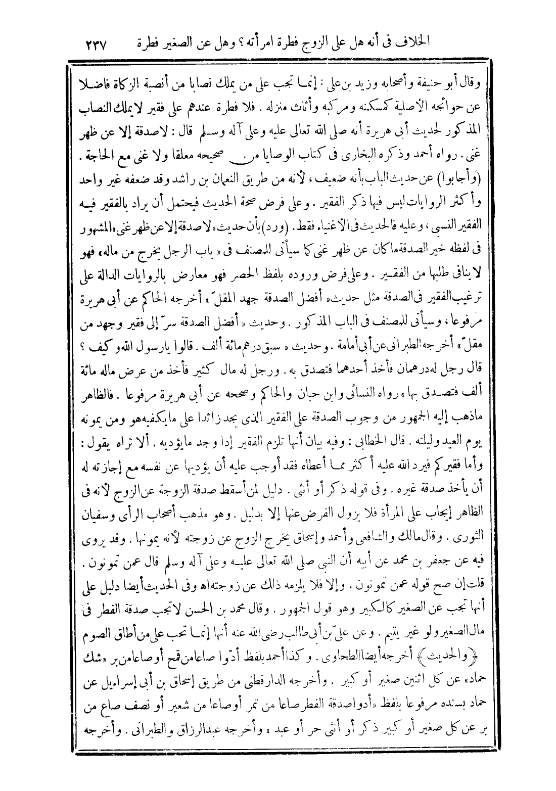 (وأجابوا) عن حديث الباب بأنه ضعيف، لأنه من طريق النعمان بن راشد وقد ضعفه غير واحد وأكثر الروايات ليس فيها ذكر الفقير. وعلى فرض صحة الحديث فيحتمل أن يراد بالفقير فيه الفقير النسبي، وعليه فالحديث في الأغنياء فقط.
