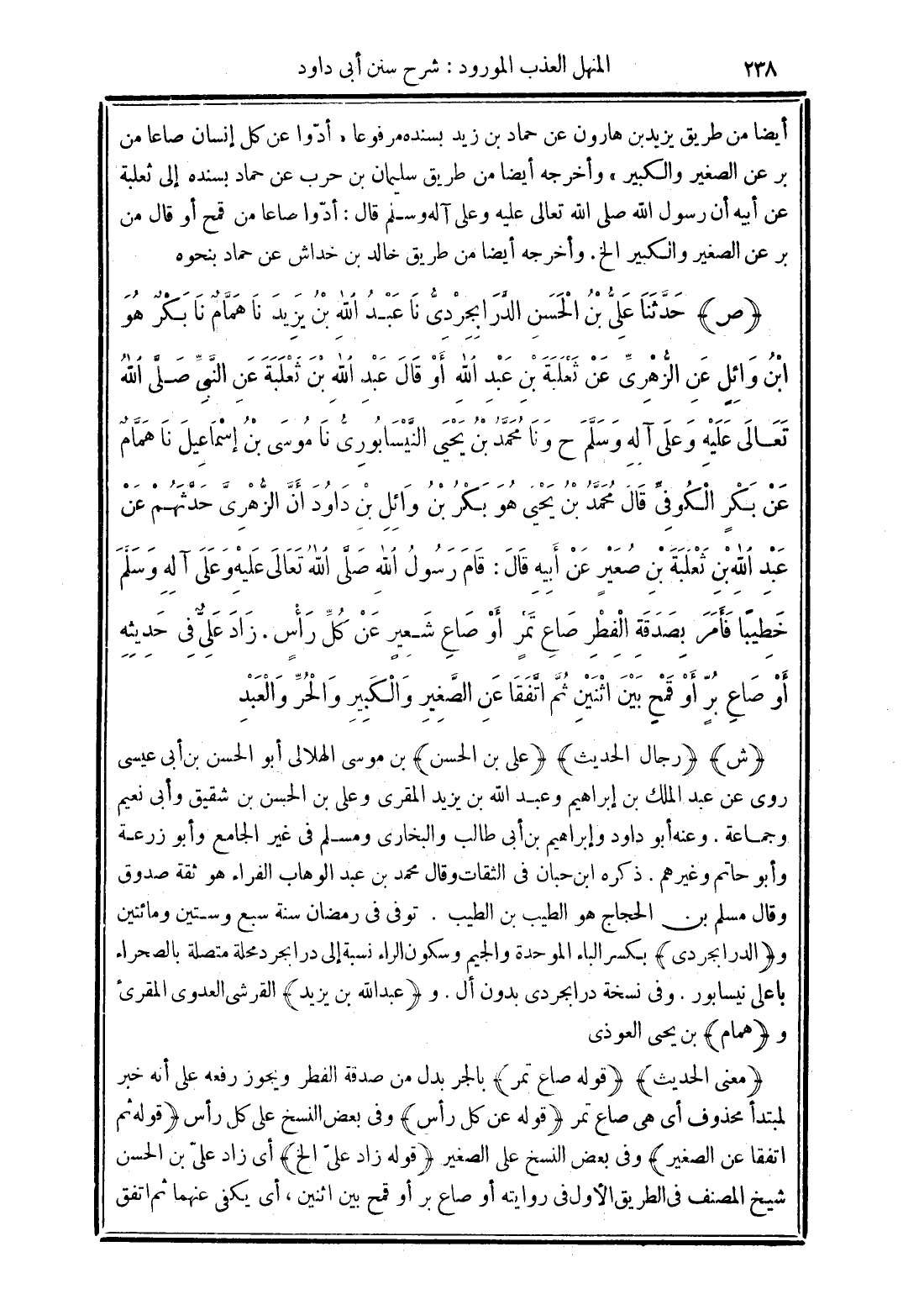 (ص) حَدَّثَنَا عَلِيُّ بْنُ الْحَسَنِ الدَّرَابَجِرْدِيُّ نَا عَبْدُ اللَّهِ بْنُ يَزِيدَ نَا هَمَّامٌ نَا بَكْرٌ -هُوَ ابْنُ وَائِلٍ- عَنِ الزُّهْرِيِّ عَنْ ثَعْلَبَةَ بْنِ عَبْدِ اللَّهِ أَوْ قَالَ عَبْدِ اللَّهِ بْنِ ثَعْلَبَةَ عَنِ النَّبِيِّ -صَلَّى الله تَعَالَى عَلَيْهِ وَعَلَى آلِهِ وَسَلَّمَ- ح وَنَا مُحَمَّدُ بْنُ يَحْيَى النَّيْسَابُورِيُّ نَا مُوسَى بْنُ إِسْمَاعِيلَ نَا هَمَّامٌ عَنْ بَكْرٍ الْكُوفِيِّ قَالَ مُحَمَّدُ بْنُ يَحْيَى هُوَ بَكْرُ بْنُ وَائِلِ بْنِ دَاوُدَ أَنَّ الزُّهْرِيَّ حَدَّثَهُمْ عَنْ عَبْدِ اللَّهِ بْنِ ثَعْلَبَةَ بْنِ صُعَيْرٍ عَنْ أَبِيهِ قَالَ قَامَ رَسُولُ اللَّهِ -صَلَّى الله تَعَالَى عَلَيْهِ وَعَلَى آلِهِ وَسَلَّمَ- خَطِيبًا فَأَمَرَ بِصَدَقَةِ الْفِطْرِ صَاعِ تَمْرٍ أَوْ صَاعِ شَعِيرٍ عَنْ كُلِّ رَأْسٍ زَادَ عَلِىٌّ فِي حَدِيثِهِ أَوْ صَاعِ بُرٍّ أَوْ قَمْحٍ بَيْنَ اثْنَيْنِ -ثُمَّ اتَّفَقَا- عَنِ الصَّغِيرِ وَالْكَبِيرِ وَالْحُرِّ وَالْعَبْدِ.