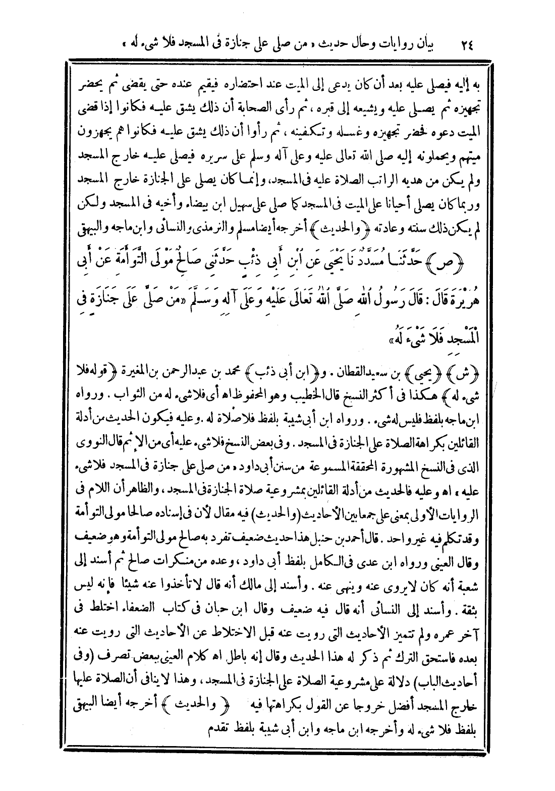 (ص) حَدَّثَنَا مُسَدَّدٌ نَا يَحْيَى عَنِ ابْنِ أَبِي ذِئْبٍ حَدَّثَنِي صَالِحٌ مَوْلَى التَّوْأَمَةِ عَنْ أَبِي هُرَيْرَةَ قَالَ قَالَ رَسُولُ اللَّهِ -صَلَّى الله تَعَالَى عَلَيْهِ وَعَلَى آلِهِ وَسَلَّمَ- "مَنْ صَلَّى عَلَى جَنَازَةٍ فِي الْمَسْجِدِ فَلاَ شَيْءَ لَهُ".